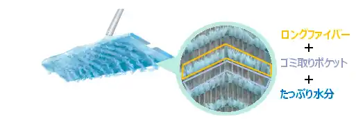 ・世界初※1の特許技術※2を採用した「ロングファイバー・ゴミ取りポケット」の起毛×水分たっぷりウェットシートにより、髪の毛や粒ゴミをしっかり絡めとりながら、ベタベタ汚れも拭き取ります。 |