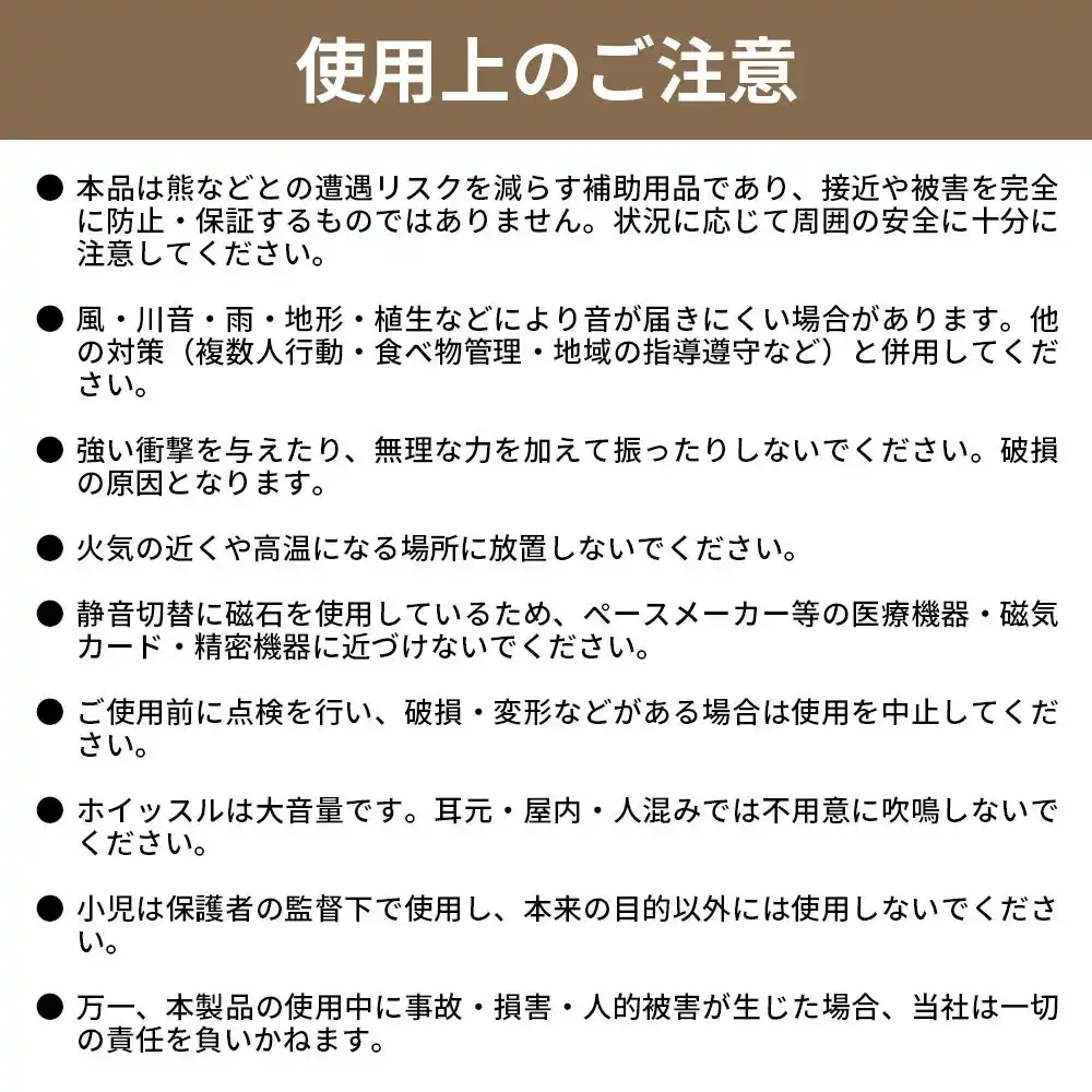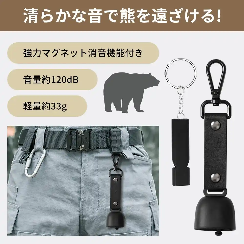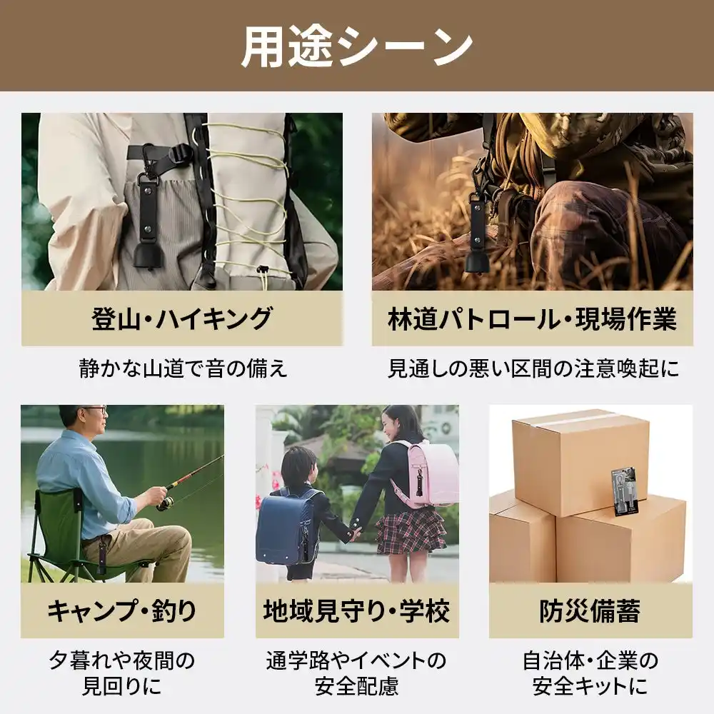 | 音で存在を知らせることで、熊など野生動物との不意の遭遇を減らす助けになります。熊は人の気配を察すると離れる習性があり、音を出すことは登山やキャンプ、農作業時の基本的な安全対策とされています。登山・林道・見回り・防災備蓄にお勧めのセットです。 | |||