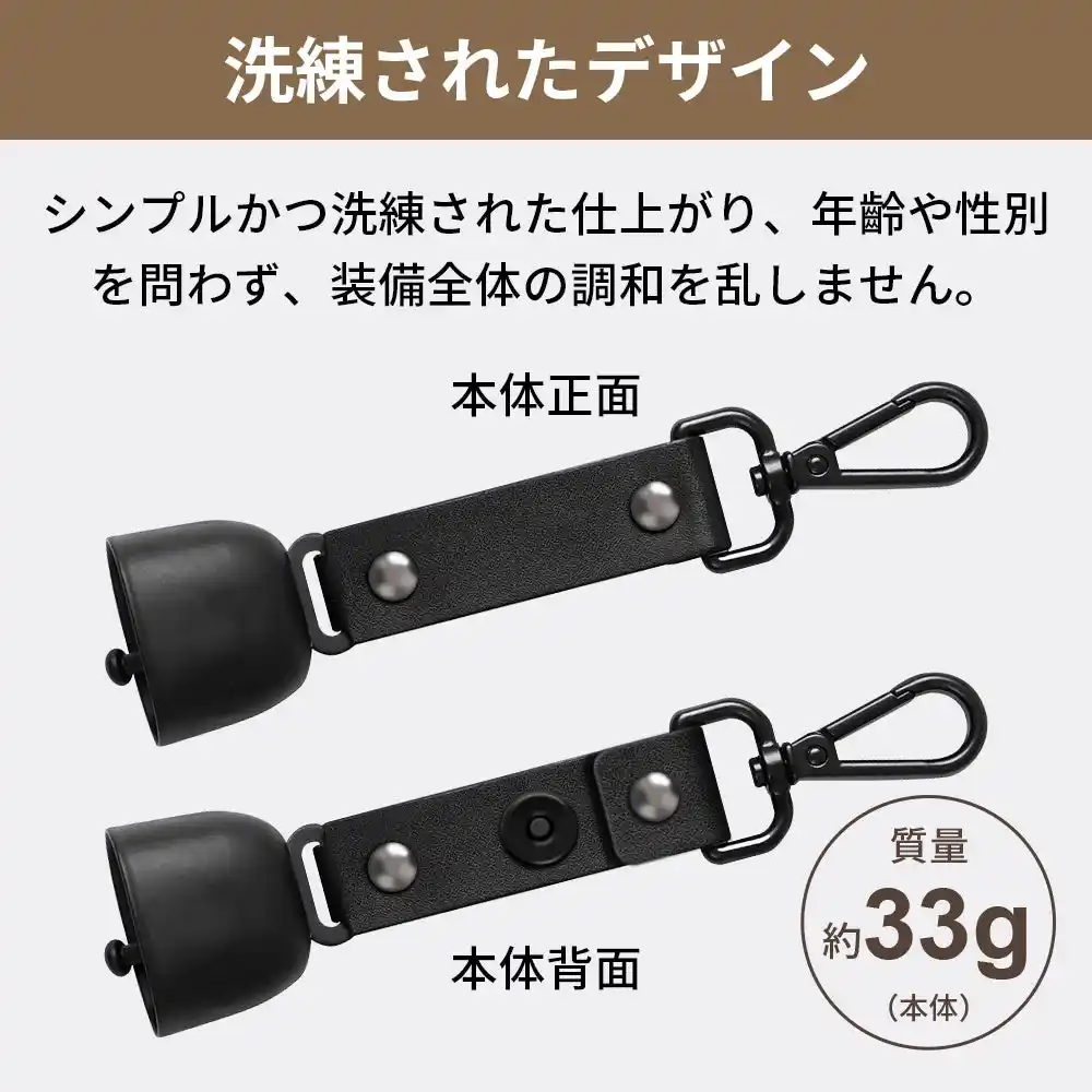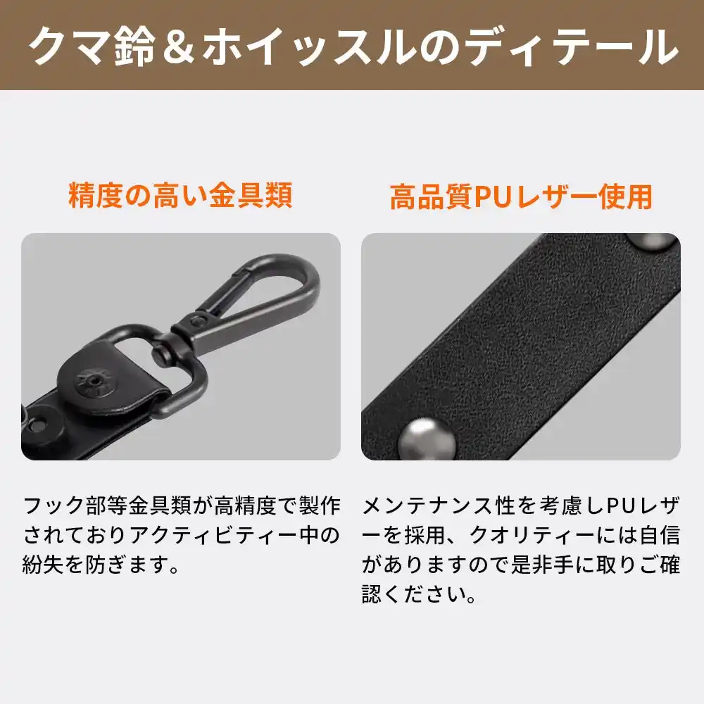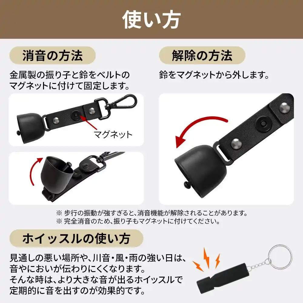 | 歩行中は鈴、視界不良・緊急時はホイッスル。音で気づかせる二段構えの対策。 |