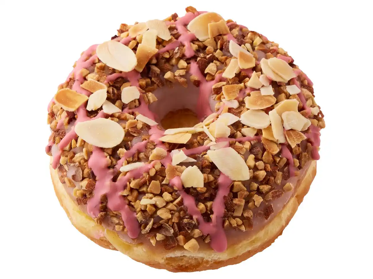 ホワイトアイシングをコーティングし、細かく砕いたアーモンド、ストロベリーチョコレート、スライスアーモンドをトッピングしました。甘酸っぱいストロベリーチョコレートにアーモンドの風味と食感を組み合わせたイーストドーナツです。 |