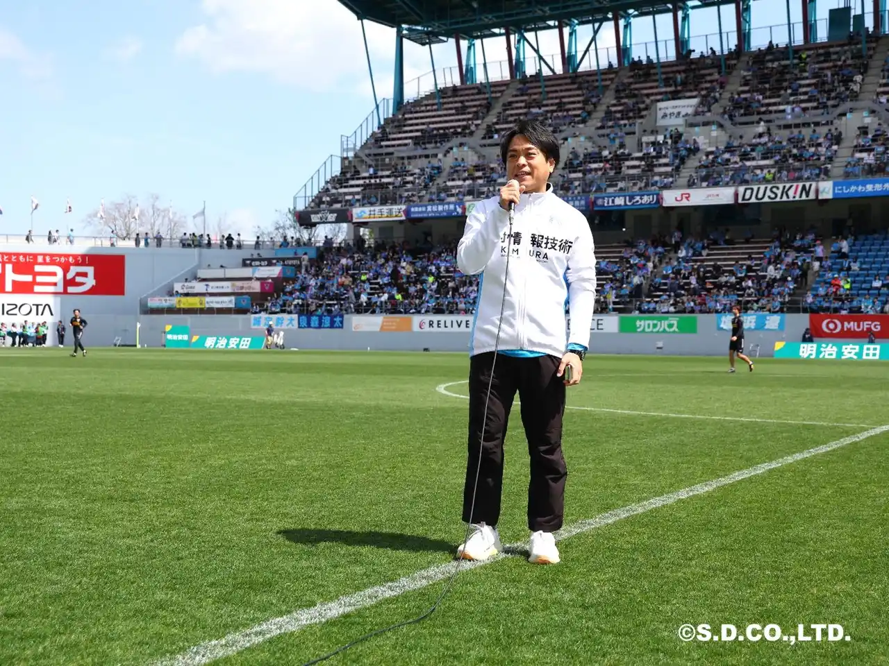 試合前には、マッチデースポンサー挨拶として木村情報技術 取締役の山口真悟が登場。新年度のスタートにあたり、新社会人をはじめとした新たな一歩を踏み出す方々へ向けたエールを送りました。 |