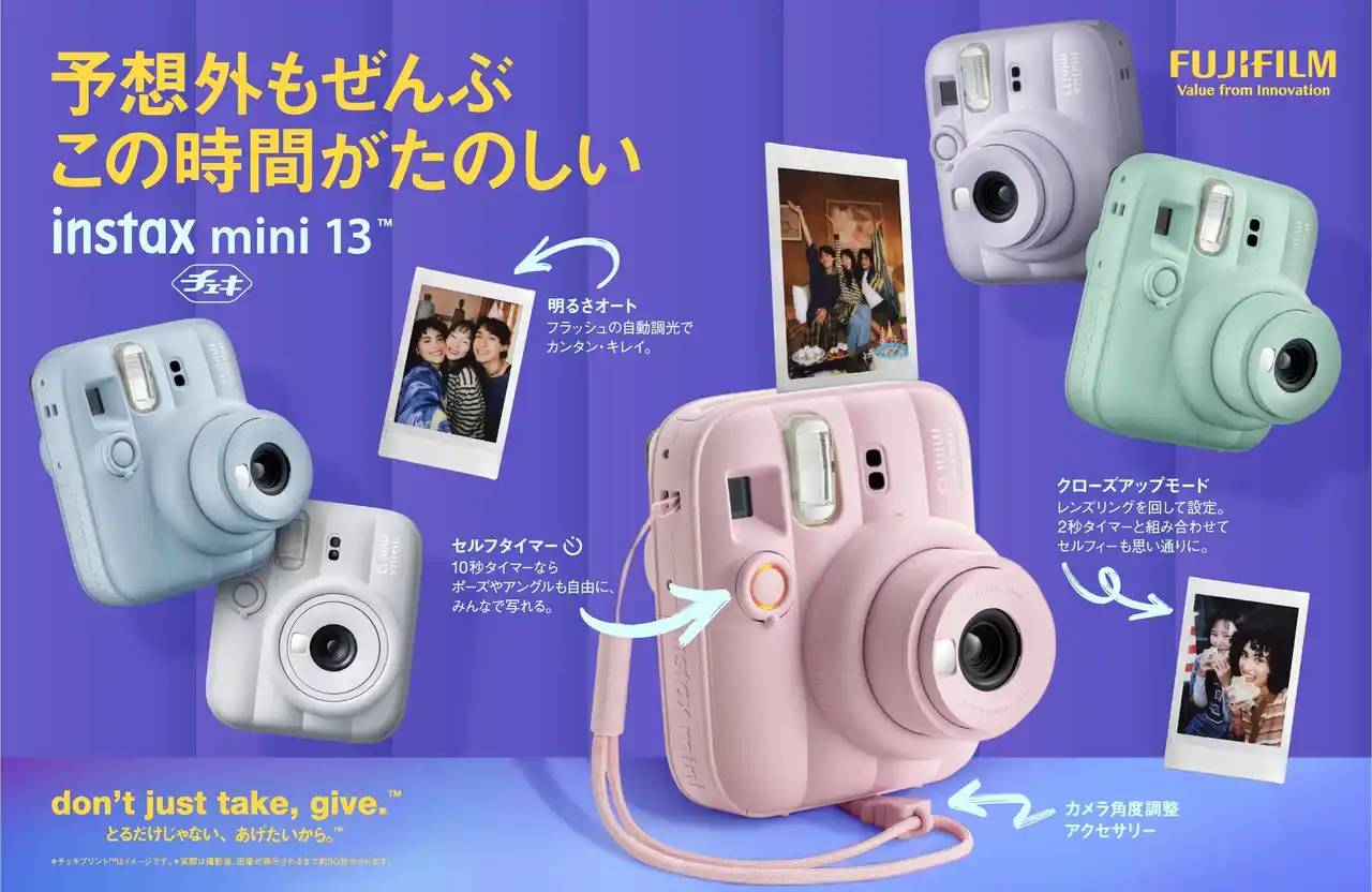 【instax(TM)“チェキ”について】 日本で“チェキ(TM)”の愛称で親しまれているインスタントフォトシステム instax(TM)は、1998年の発売以降、時代とともにトレンドや進化する技術を取り入れ、アナログインスタントカメラに加えて、デジタル技術を取り入れたハイブリッドインスタントカメラ、スマホプリンター、手のひらサイズカメラとラインアップを拡充。多様な写真の楽しみ方を提供し、ユーザー層を拡大しています。現在、instax(TM)は世界100か国以上で展開し、累計で1億台以上を販売しています。 *instax、チェキ、チェキプリント、instax mini 12、およびinstax mini 13は、富士フイルム株式会社の登録商標または商標です。 |