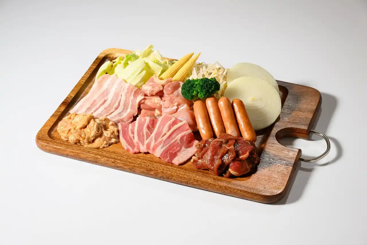 【内容】味付けラム・牛カルビ・豚カルビ・鶏もも・ウインナー・豚味噌ホルモン・野菜各種・ライス |
