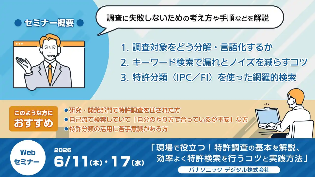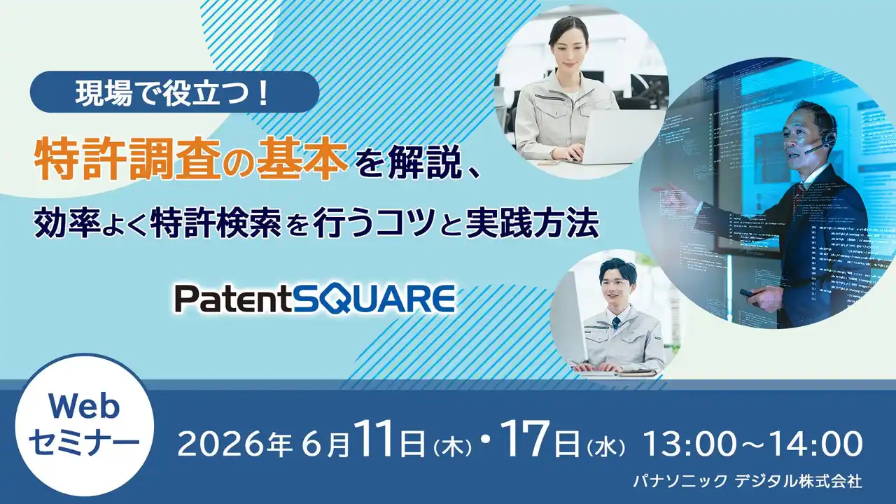 | パナソニック デジタル株式会社(本社:大阪府、代表取締役 社長執行役員:阿部 裕)はこの度、Webセミナー「現場で役立つ!特許調査の基本を解説、効率よく特許検索を行うコツと実践方法」を開催します。研究・開発や知的財産業務において欠かせない「特許調査」。一方で、「検索漏れがないか不安」「ヒット件数が多すぎて査読が追いつかない」といった課題を抱える担当者も少なくありません。こうした課題を背景に、特許調査の基本的な考え方から具体的な検索手法までを解説する無料Webセミナーを2026年6月11日(木)、6月17日(水)に開催します。 | ||||||||||