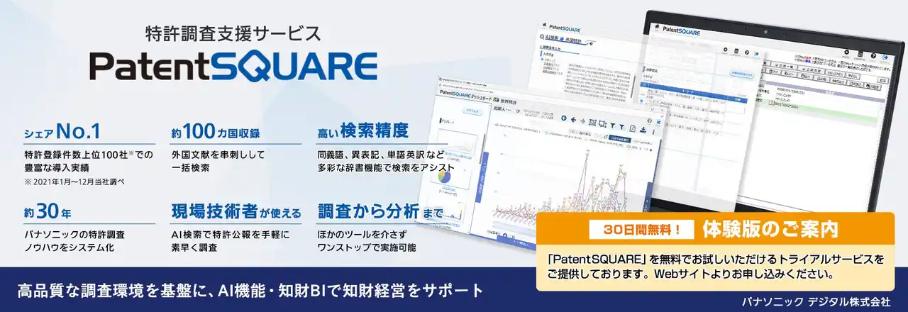 | パナソニック デジタルの「PatentSQUARE」は、特許調査から分析までワンストップで行えるサービスとして、これまでお客様の特許情報の活用促進を目指し、本製品の開発、改良に取り組んでまいりました。今後も、PatentSQUAREで培った実務知見とAIをはじめとした最先端の技術の融合で、お客様のイノベーションと知財DXの実現を支援してまいります。 | ||||||||||