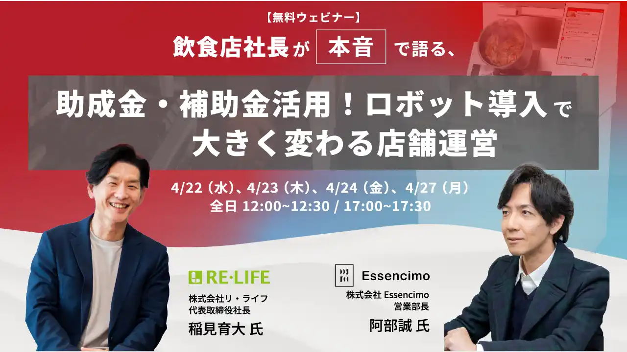 本ウェビナーでは、炒め調理ロボット「I-Robo 2」を実際に導入した中華料理店「Lei can ting」を運営する株式会社リ・ライフ 代表取締役社長 稲見育大氏をゲストに迎え、助成金を活用した導入の経緯や、申請から運用開始までの実体験を紹介します。さらに、補助金・助成金活用支援を手がける株式会社Essencimo 阿部誠氏が登壇し、制度の仕組みや活用のポイントについて解説します。 |