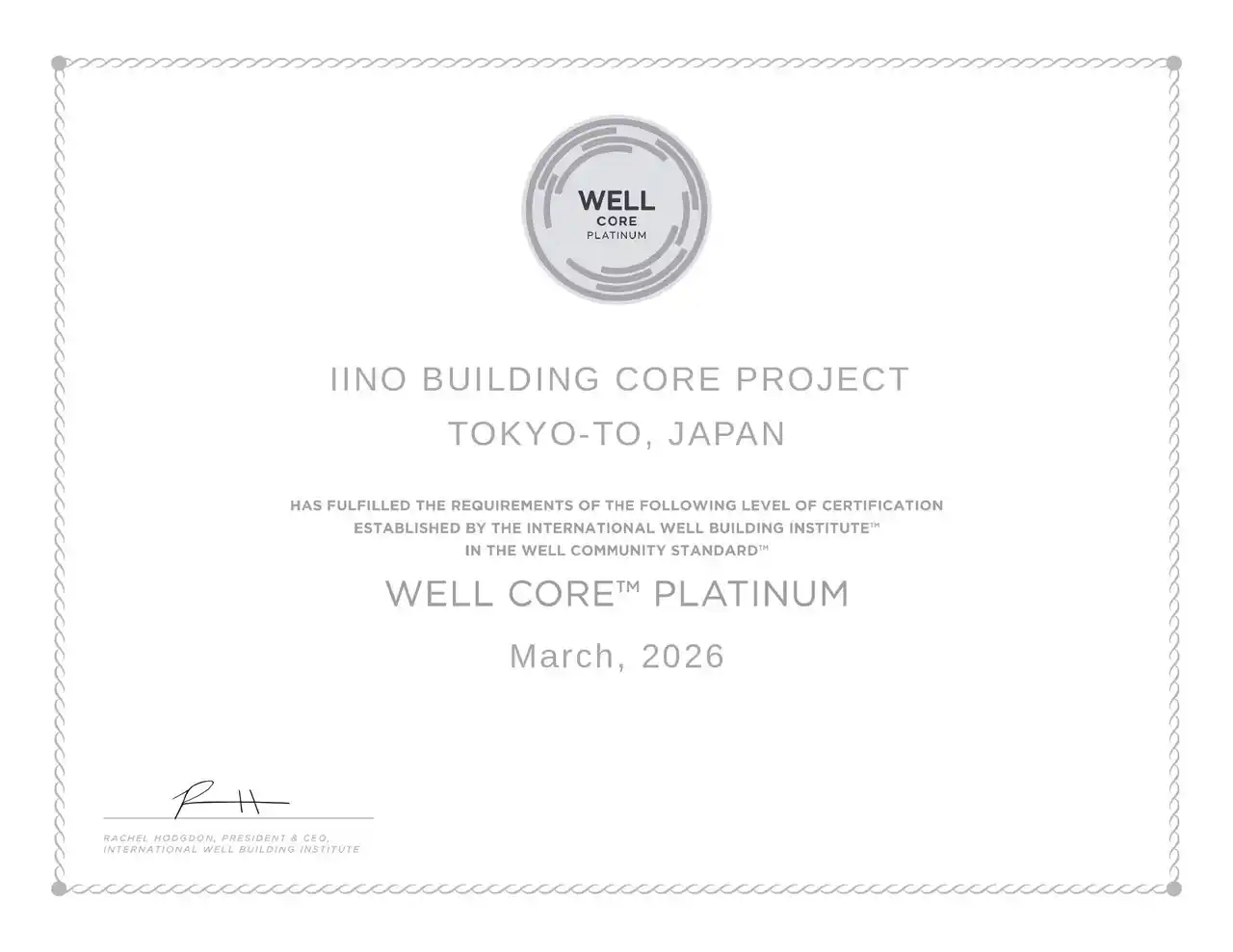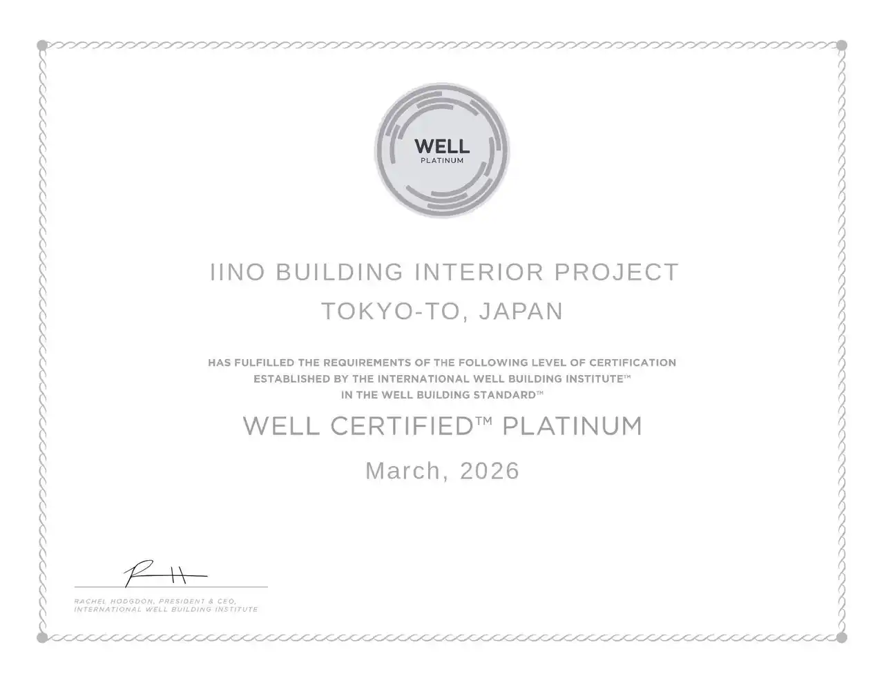 | 飯野海運株式会社(本社:東京都千代田区、代表取締役社長:大谷 祐介)は、2026年3月、本社オフィスを評価対象とした「WELL(TM)認証 v2」、またビル共用部を評価対象とした「WELL Core(TM)認証 v2」のそれぞれについて、最高ランクである「プラチナ」を取得しました。株式会社ヴォンエルフ(本社:東京都千代田区、代表取締役:平松 宏城、以下「当社」)は、本プロジェクトにおいて、認証取得支援を担当いたしました。 | |||||||||