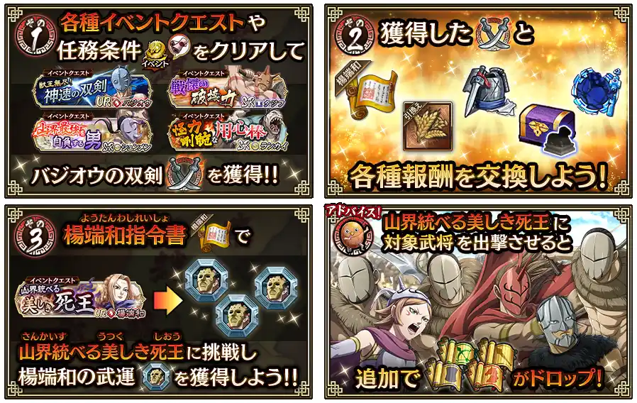 指定された武将でイベントクエスト『山界統べる美しき死王』をクリアすると、『騎兵の書 中級』『歩兵の書 中級』『盾兵の書 中級』『弓兵の書 中級』いずれかを追加で獲得できます! |