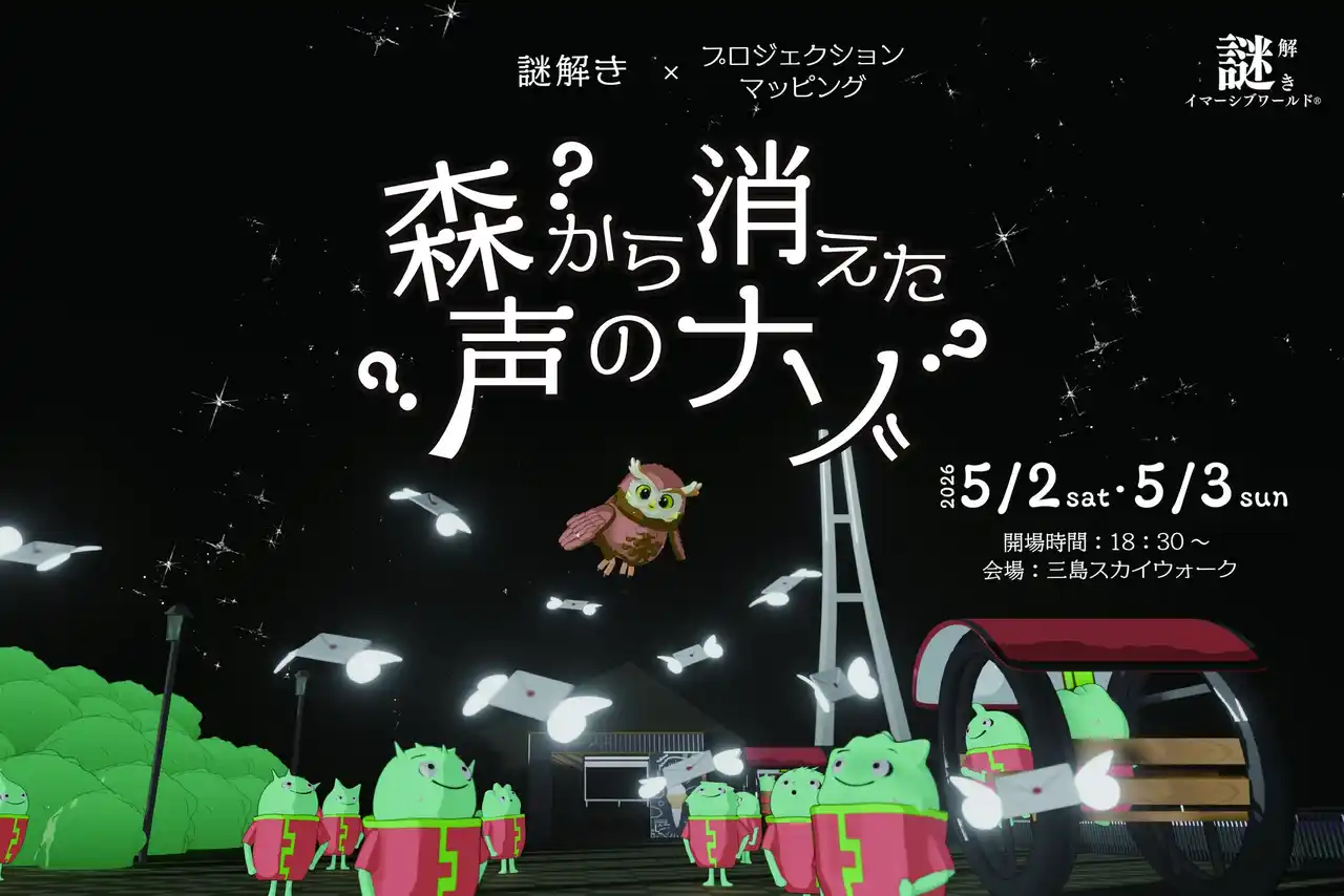 富士山を望む全長400mの大つり橋「三島スカイウォーク」(所在地:静岡県三島市、運営:株式会社スカイウォーク、本社:静岡県三島市、代表:宮澤俊二)は、三島エリア初※1となる、夜間の屋外プロジェクションマッピングと謎解きを組み合わせた没入型ナイトエンターテイメント「謎解きイマーシブワールド(R) ?森から消えた声のナゾ?」を2026年5月2日(土)・3日(日)の2日間限定で開催します。あわせて、本イベントのチケット発売を本日4月16日(木)より開始します。 |