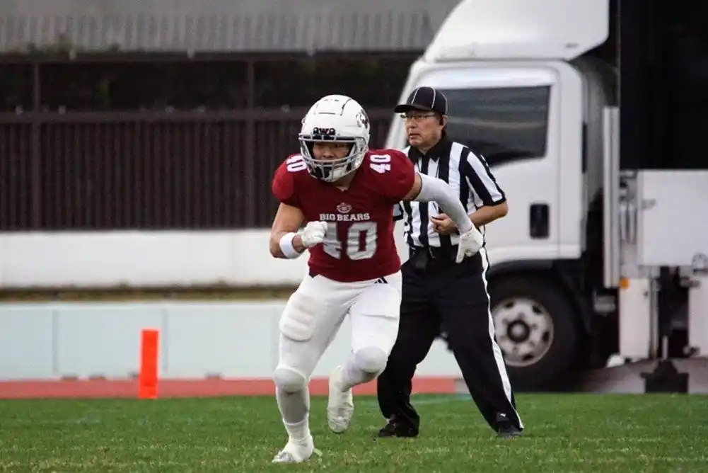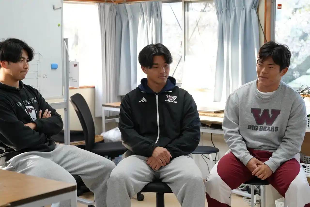 | 木庭:僕たち、同じ日に試合をしていましたよね。あと、嵐が丘で試合をしていたのも覚えています。(ワセダクラブ出身で2026年卒、BIG BEARS元QBの)船橋さんがタッチダウンしていたのが印象的でした。 | |||||||||