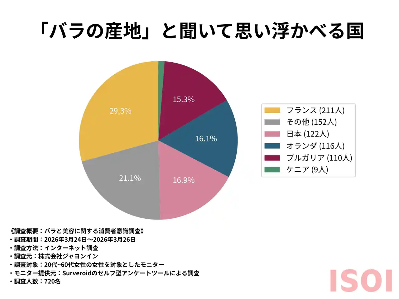 実際に「バラの産地」と聞いて思い浮かべる国を尋ねたところ、1位はフランス(29.3%)となり、世界的な名産地であるはずのブルガリアはわずか15.3%にとどまる結果となりました。 |