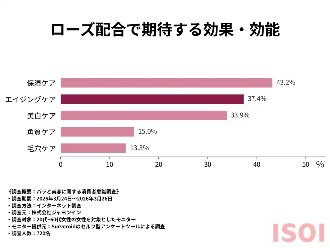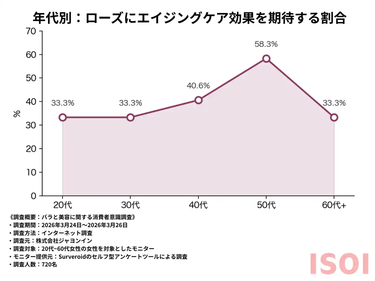 さらに、ローズ配合商品に期待する効果としては、「保湿ケア(43.2%)」に次いで、「エイジングケア(37.4%)」が高い支持を集めました。年齢別に見ると、このエイジングケアへの期待は40代で40.6%、50代では58.3%に達しており、年齢を重ねるごとに手応えを求める傾向が明確に出ています。 |