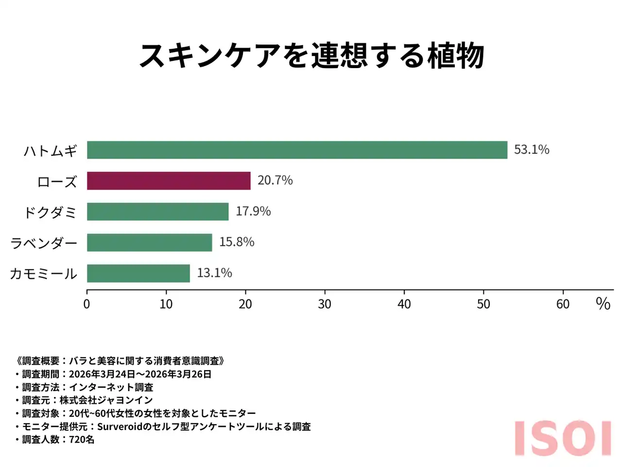スキンケアにおいて、今回の調査 (n=720)で「スキンケア商品を連想する植物」を尋ねたところ、日常的なケアとして定着しているハトムギ(53.1%)に次いで、ローズが20.7%で第2位という結果に。 |