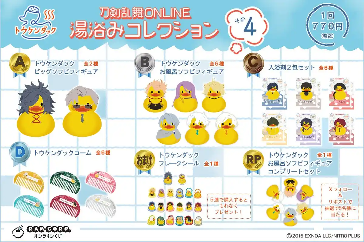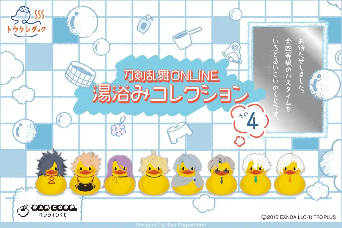 シリーズ第4弾となる今回のくじは、前弾に引き続き、刀剣男士たちが"お風呂のアヒル"になったオリジナルデザインの「トウケンダック」を全等級にラインナップ。 |