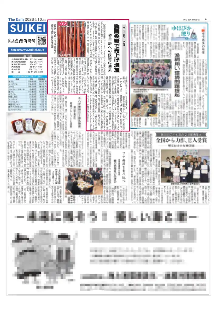 )でTikTok運用を支援している株式会社ヤマニ野口水産(北海道留萌市)の事例が、2026年4月10日付の水産経済新聞に掲載されたことをお知らせいたします。