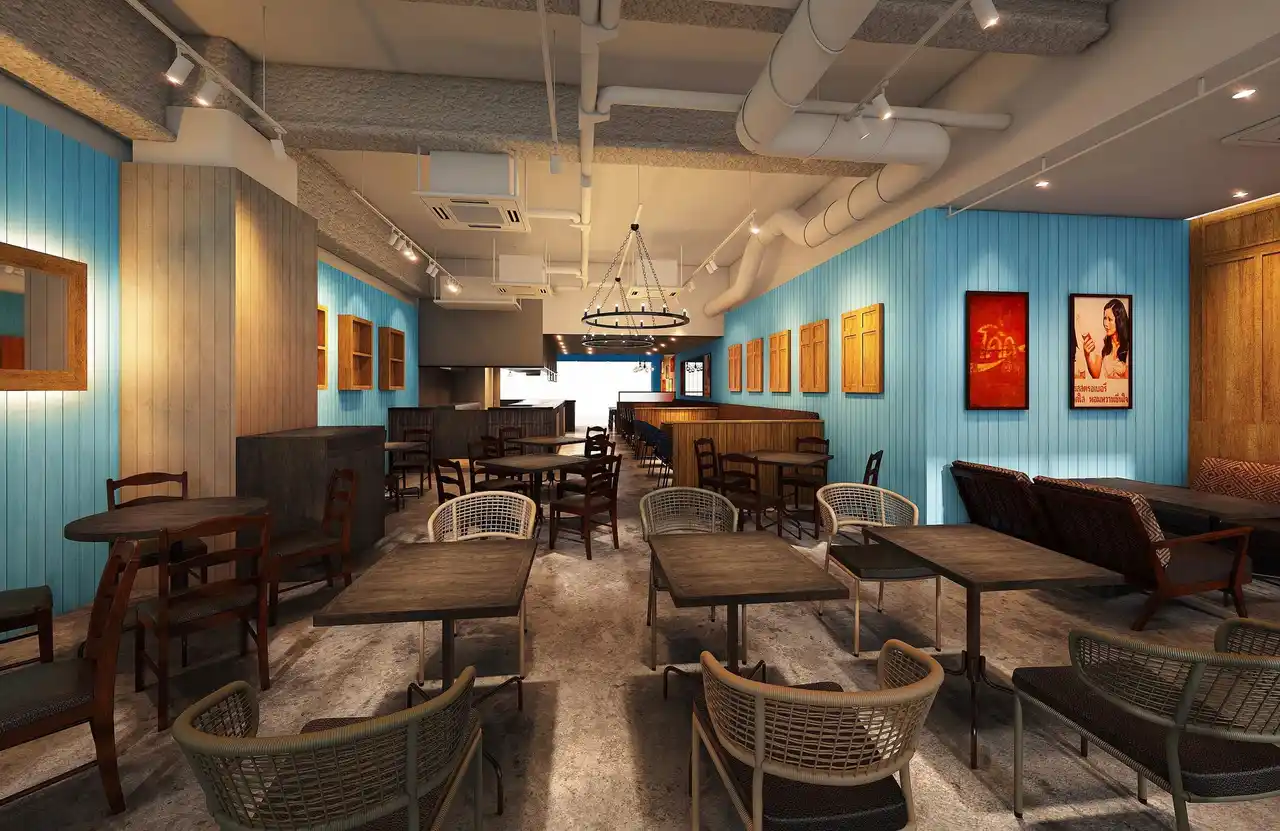 店内は、ブルーを基調に、木製の窓枠やチーク材の床を配し、タイの歴史を感じさせるデザイン。窓の先には海を望むテラス席を備え、みなとみらいの景色と海風を感じられる開放的な空間をご用意しています。テラス席はドッグフレンドリーで、貸切利用にも対応いたします。 |