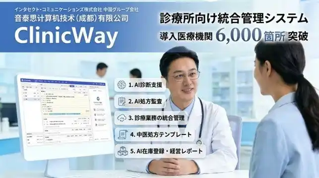 システム開発やDXソリューション事業、キャッシュレス化支援などを展開するインタセクト・コミュニケーションズ株式会社(本社:東京都千代田区、代表取締役社長:譚玉峰、以下インタセクト)は、中国・四川省成都市の現地法人において開発した診療所向け統合管理システム「Clinic Way(クリニックウェイ)」が、成都市を中心とした中国の医療機関6,000箇所以上に導入されていることを発表しました。 |