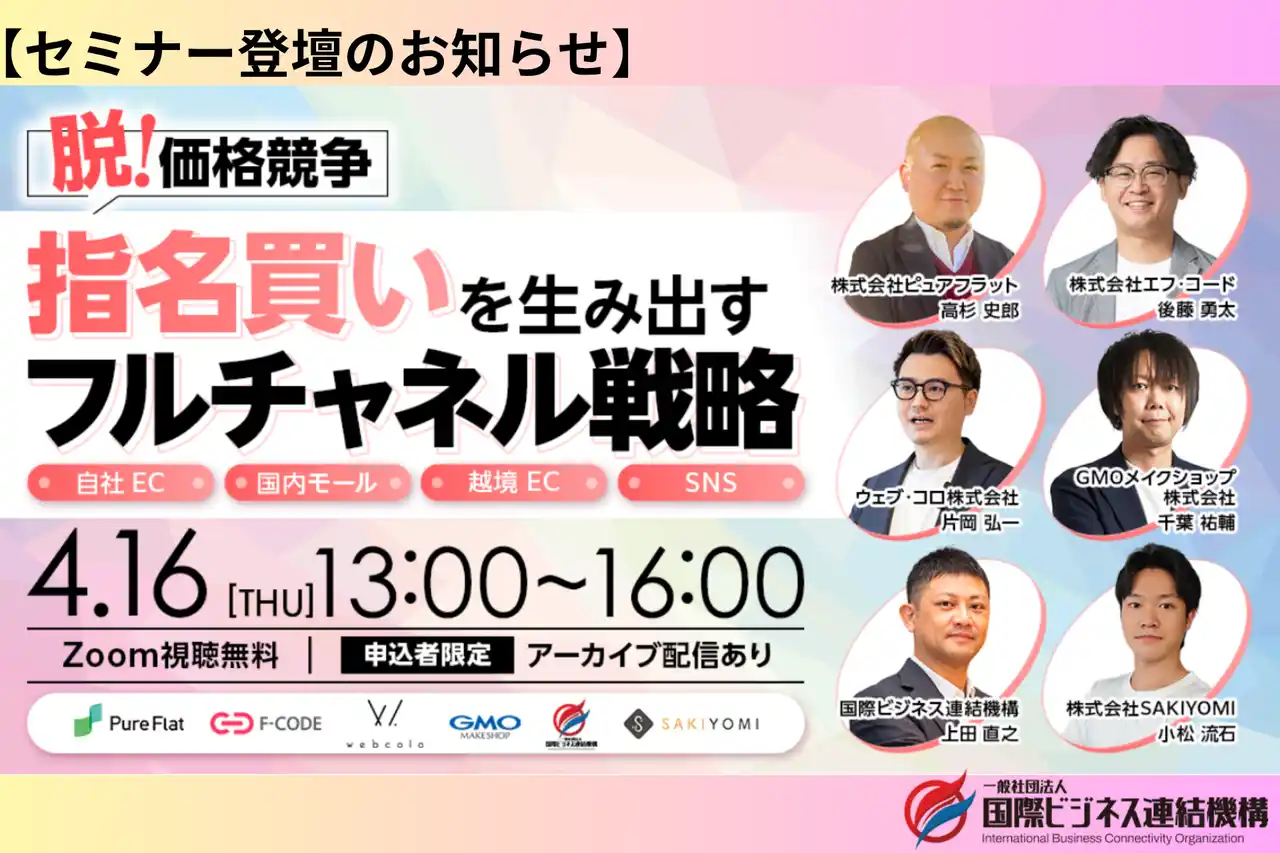 一般社団法人国際ビジネス連結(本社:東京都、以下「当団体」)の理事である上田が、株式会社ピュアフラット(本社:東京都港区、代表取締役:片平健太)主催のオンラインセミナー「脱・価格競争!『指名買い』を生み出すフルチャネル戦略 ~自社EC×国内モール×越境EC×SNS~」に登壇することをお知らせいたします。