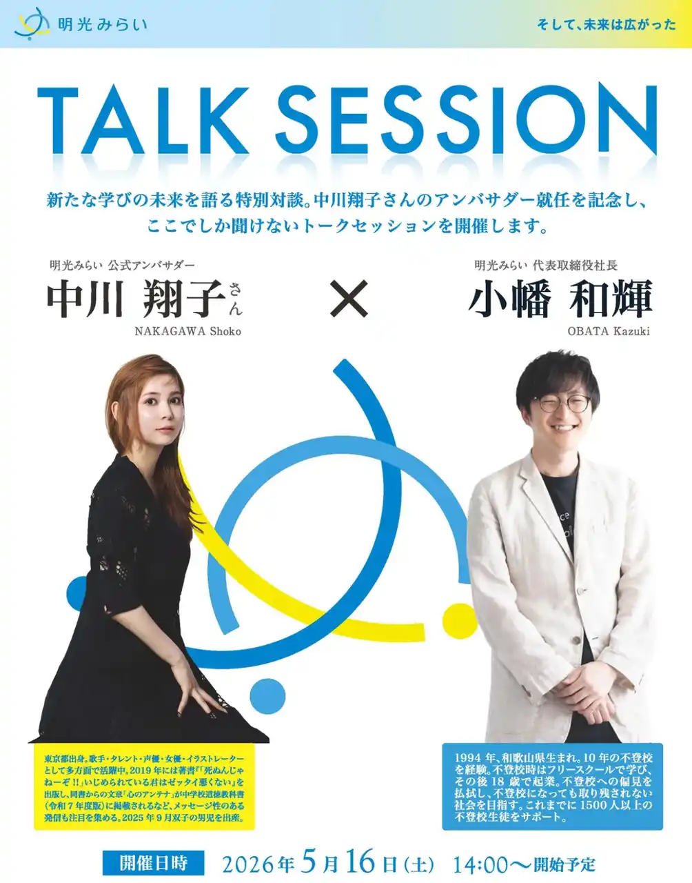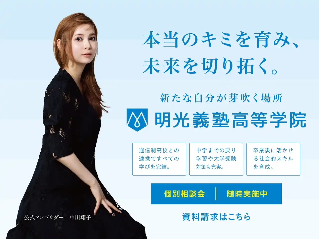 株式会社明光みらい(本社:東京都新宿区 代表取締役社長:小幡 和輝)は、2026年4月、高田馬場に「明光義塾高等学院」を開校いたしました。本校の校長には、高野 礼央奈(25歳)が就任します。教育業界において異例の若さとなる日本最年少※25歳の校長誕生となります。(※自社調べ:2026年4月時点)また、本校の公式アンバサダーにはタレントの中川翔子さんが就任。記念イベントの開催も決定いたしました。 |