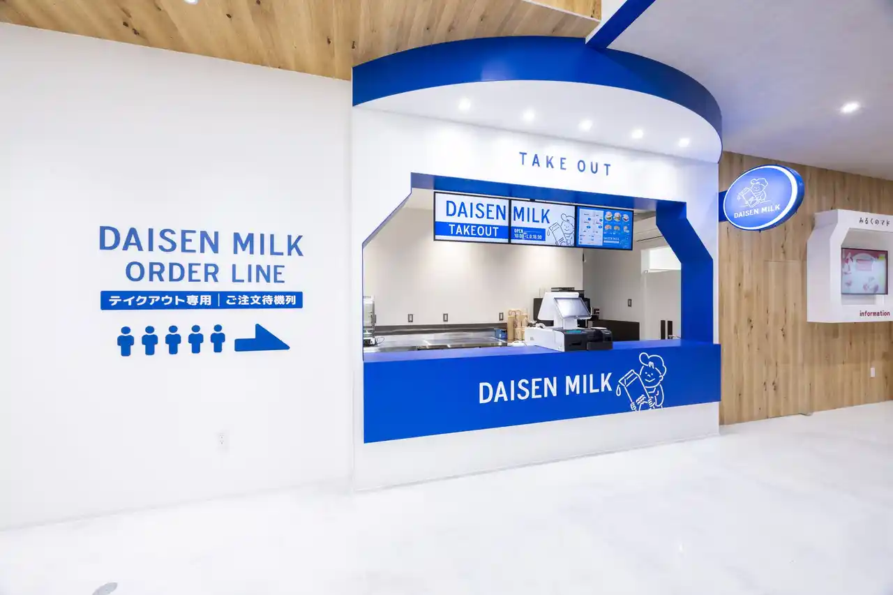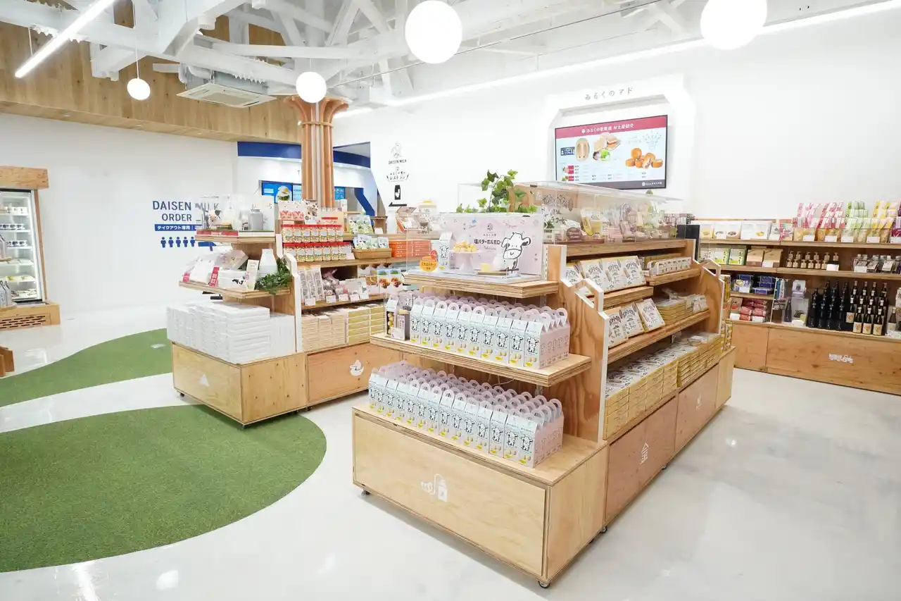 物販エリアは、牧場をイメージした曲線的なレイアウトの中に、天井を高くした開放的な空間設計で、「大山の自然を感じる空間」を目指しました。物販エリアの一角では、新ブランド「DAISEN MILK」として、テイクアウトコーナーがスタートします。 |