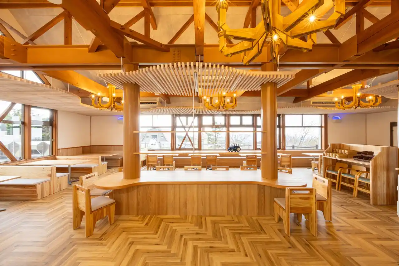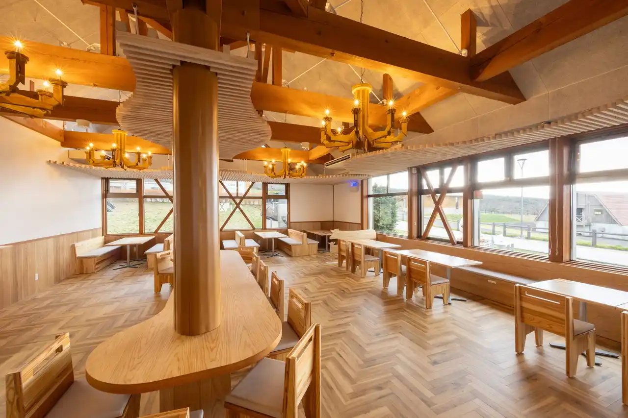 レストランエリアでは大山乳業の牛乳や乳製品を使った料理、スイーツ、鳥取県産牛肉の料理が充実しています。レストランのテーブル天板とイスで使用する材料は、鳥取県産の木材です。 |