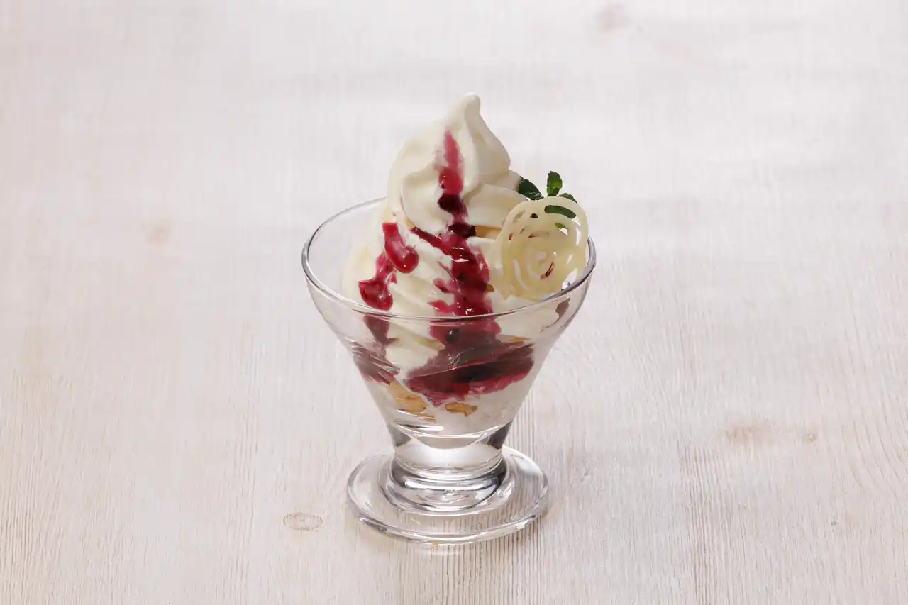 みるくの里特製ソフトクリームをのせたミニサイズのパフェです。 |