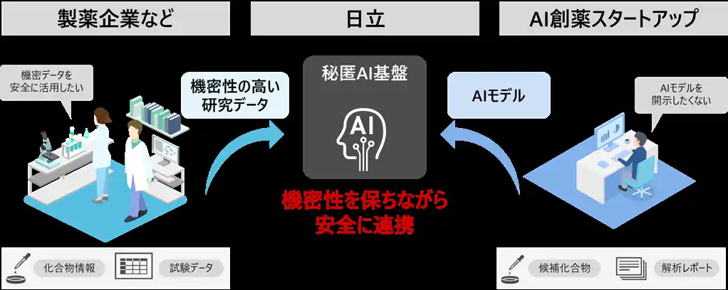 株式会社日立製作所(以下、日立)は、オープンイノベーションによるAI創薬を加速させる「秘匿AI基盤」(以下、本基盤)を開発します。本基盤は、日立が有する秘匿情報管理技術*1や、医薬・IT・AI活用に関するドメインナレッジを活用したもので、製薬企業やアカデミアなどが持つ機密性の高い研究データとAI創薬スタートアップのAIモデルを、互いに開示することなく安全に連携することができるため、創薬へのAI活用を促進し、創薬プロセスの効率化に貢献します。日立は創薬領域のAIモデルを強みとする株式会社MOLCURE(以下、MOLCURE)との協創を通じて、2026年度から本基盤をベースとした「OI(オープンイノベーション*2)創薬基盤サービス(以下、本サービス)」としての提供開始をめざし、本格的な検討を進めていきます。 |
