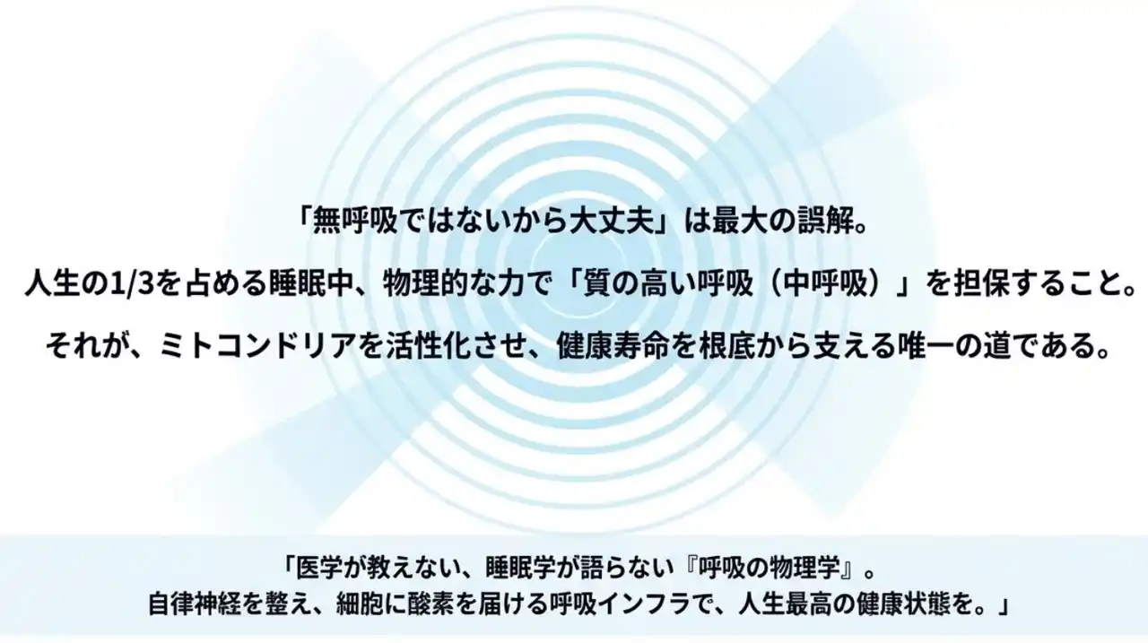 | 【国民へ】「『無呼吸ではないから安心』という認識は誤解です。」人生の1/3の「浅い呼吸」が、数十年後の大病リスクが高まることを知るべきです。 | |||