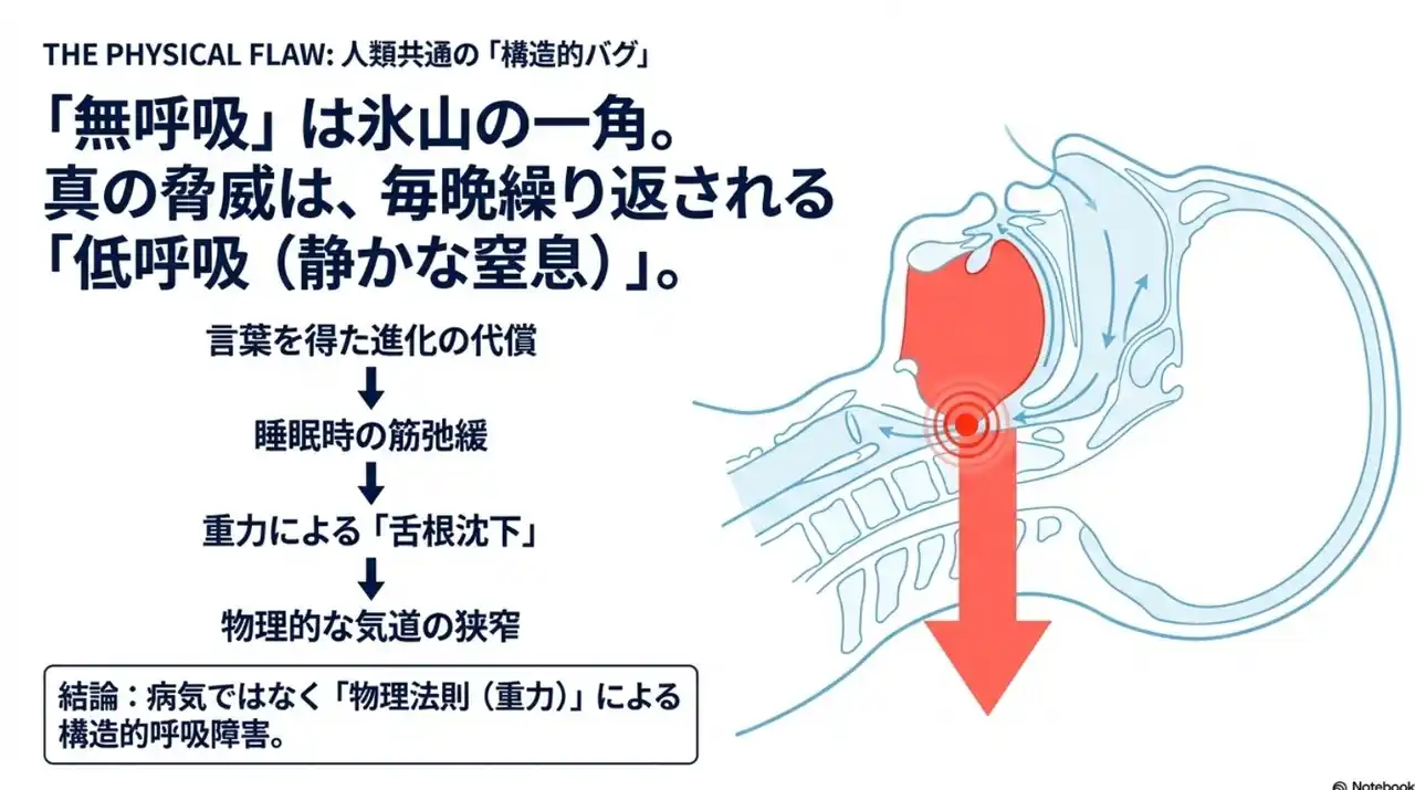 | 現代の睡眠医学は「無呼吸(0か1か)、わずかでも呼吸をしているか」を基準としていますが、生理学の視点に立てば、人生の1/3という膨大な時間を「呼吸が浅い状態(低換気)」で過ごすことの累積こそが、深刻な健康リスクを招く真の要因です。 | |||