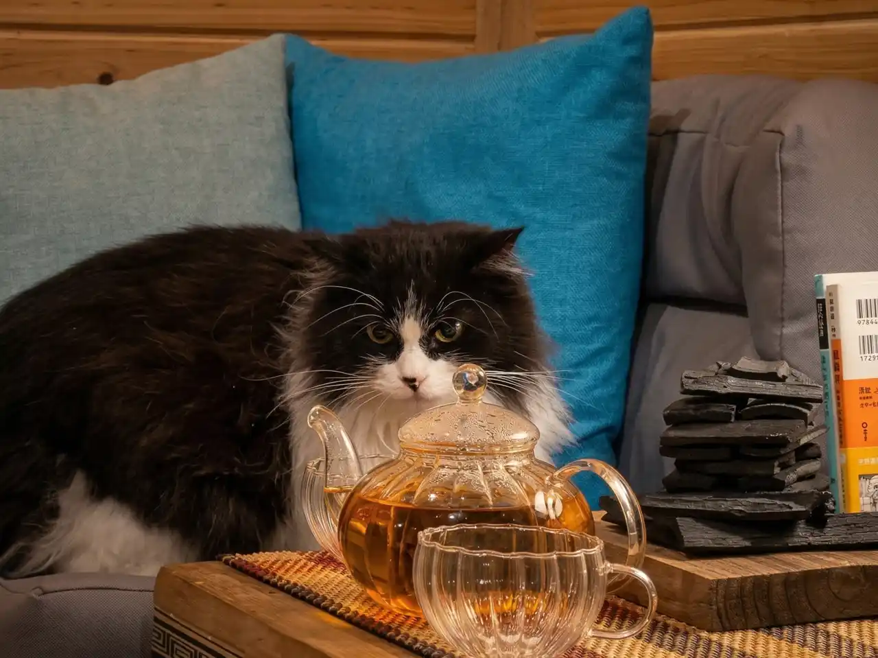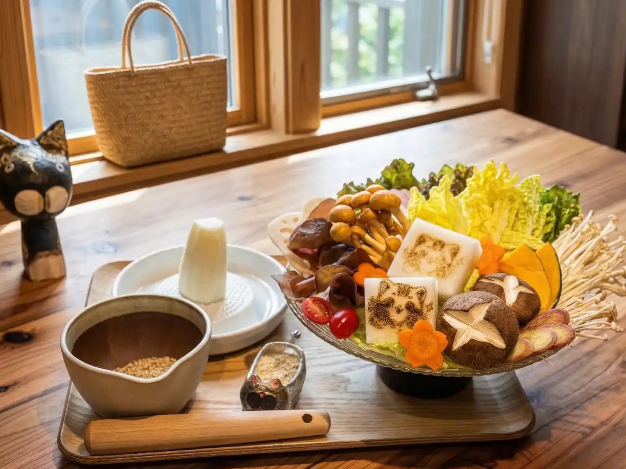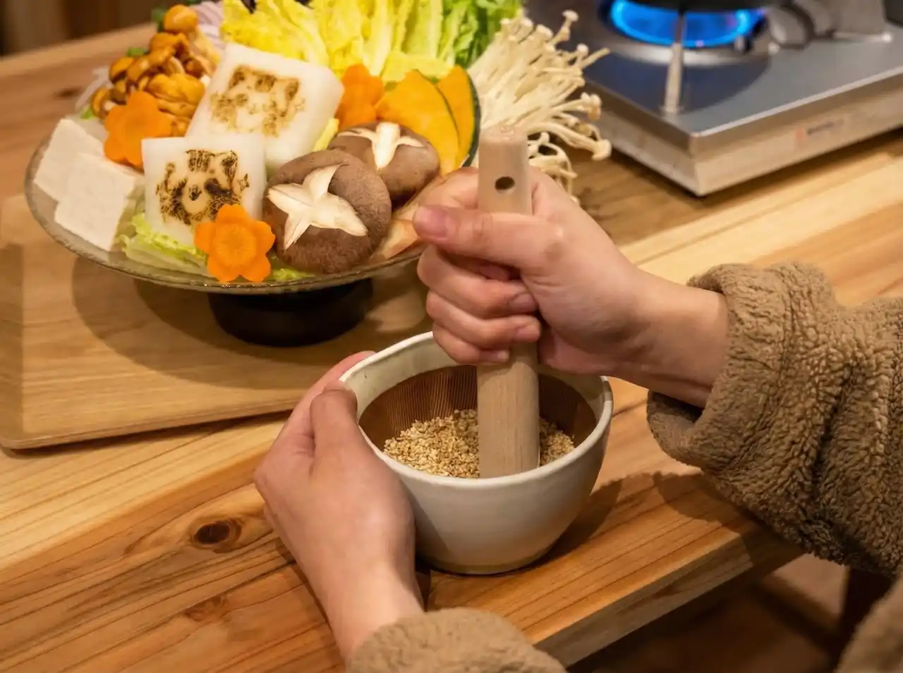 食べる前から体験が始まります。漢方食材をスープに入れ、薪ストーブの暖かさを感じながら20分ゆっくりと煮出します。その待つ間、お客様自らの手でごまだれと大根おろしを磨いて、たれを仕上げていただきます。台湾茶を飲みながら漢方の物語を読んだり、猫と遊んだり。待つ時間さえも、心ほぐれる体験のひとつです。 |