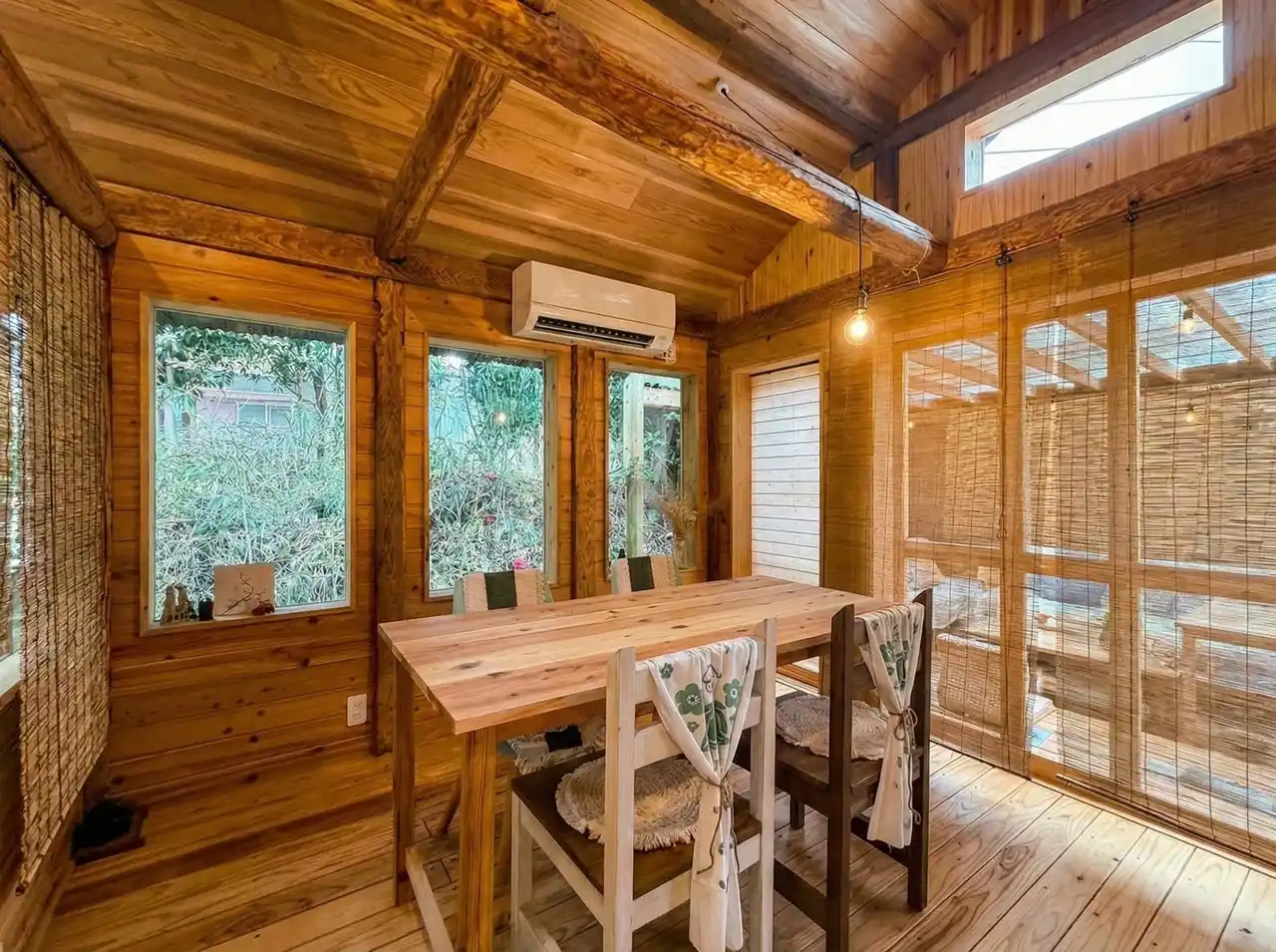 元牛舎を改装した全木造りの独立した離れに、食事スペースと休憩スペースを備えた2つの個室空間をご用意しました。ランチは1日2組限定。あなただけの静寂な空間で、木の香りと漏れてくる光に包まれながらお過ごしいただけます。人混みを気にすることなく、完全なプライベートタイムをお約束します。 |
