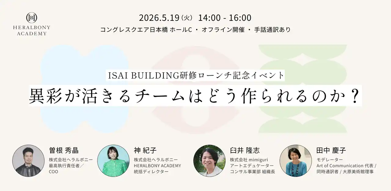 インクルーシブなチームづくりの実践知を持つHERALBONY ACADEMYが、『冒険する組織のつくりかた』などの著書で知られる安斎勇樹氏が代表取締役Co-CEOを務める組織開発・経営コンサルティングファームの株式会社MIMIGURI(本社:東京都文京区、代表:ミナベトモミ、安斎勇樹、以下「MIMIGURI」)監修のもと開発しました。「ちがい」を面白がりながら事業価値を創出するチームづくりを目指す、4.5時間の体験型プログラムです。本プログラムの思想や背景を紐解く場として、2026年5月19日(火)にMIMIGURIとサービスローンチ対談イベントを開催します。 |