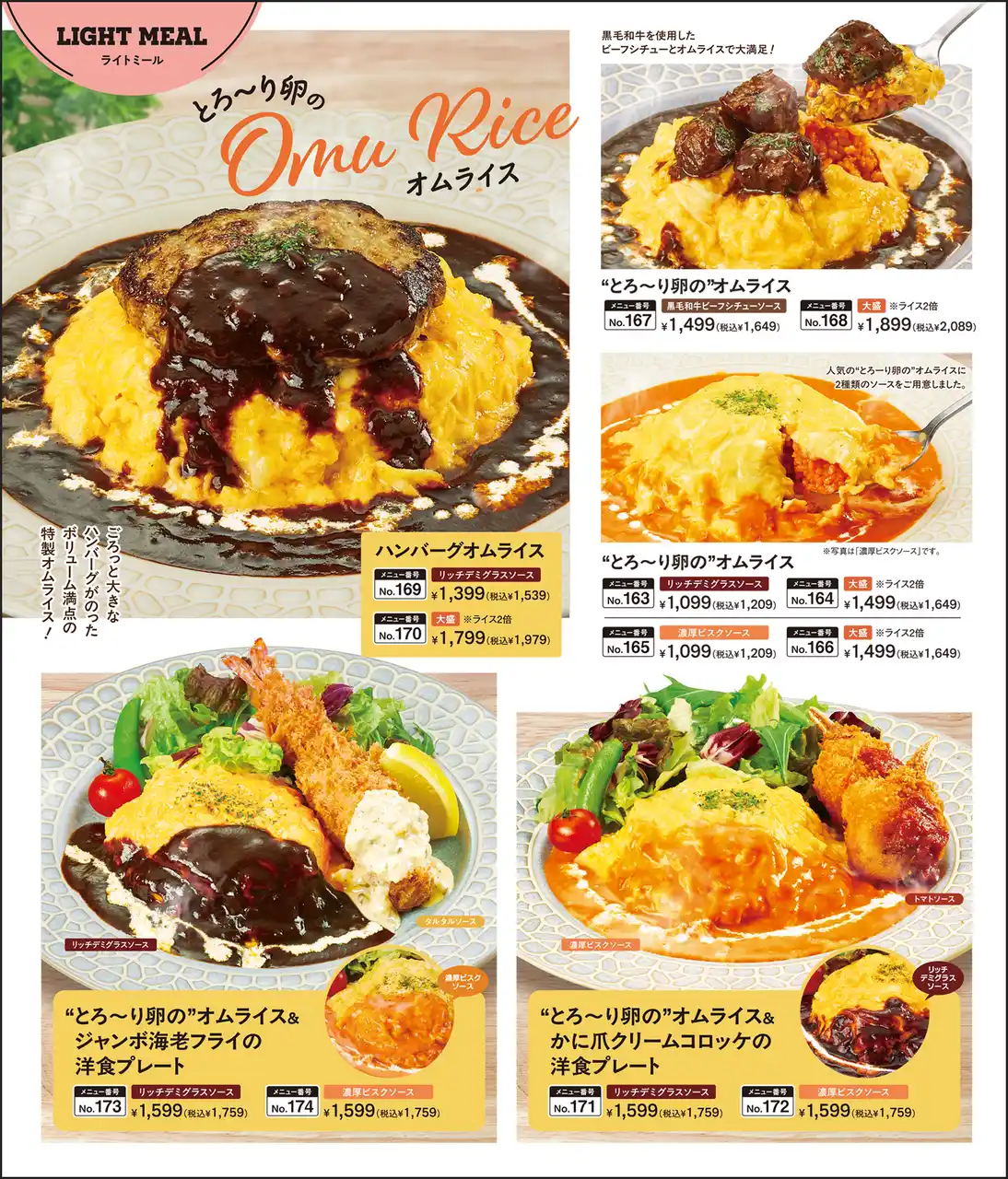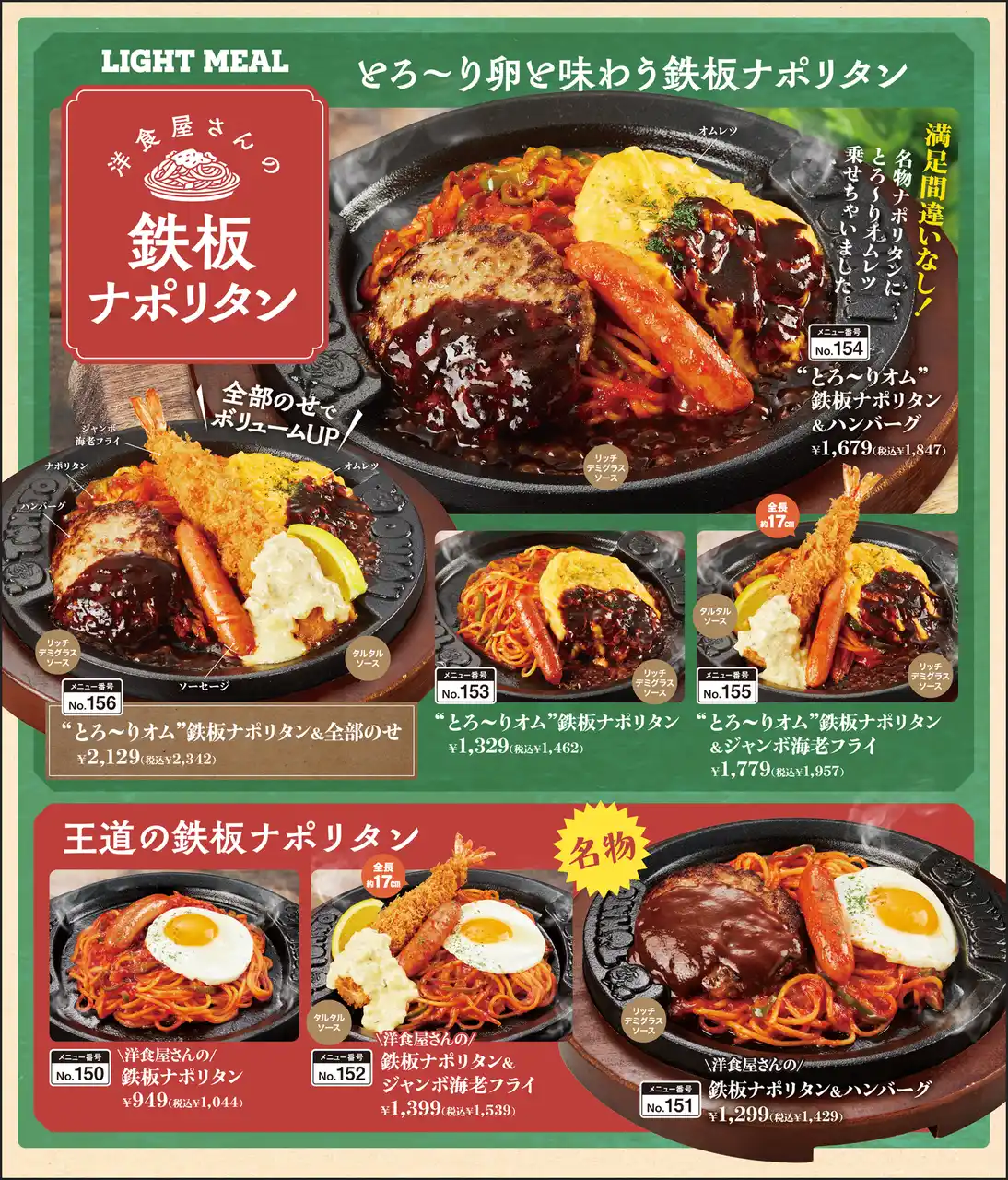 オムライスやパスタ、和食などのメニューの魅力がパワーアップ!お客様のご要望にお応えして、オムライスのごはん大盛りが可能に、さらにナポリタンはトッピングのバリエーションが増えました。 |