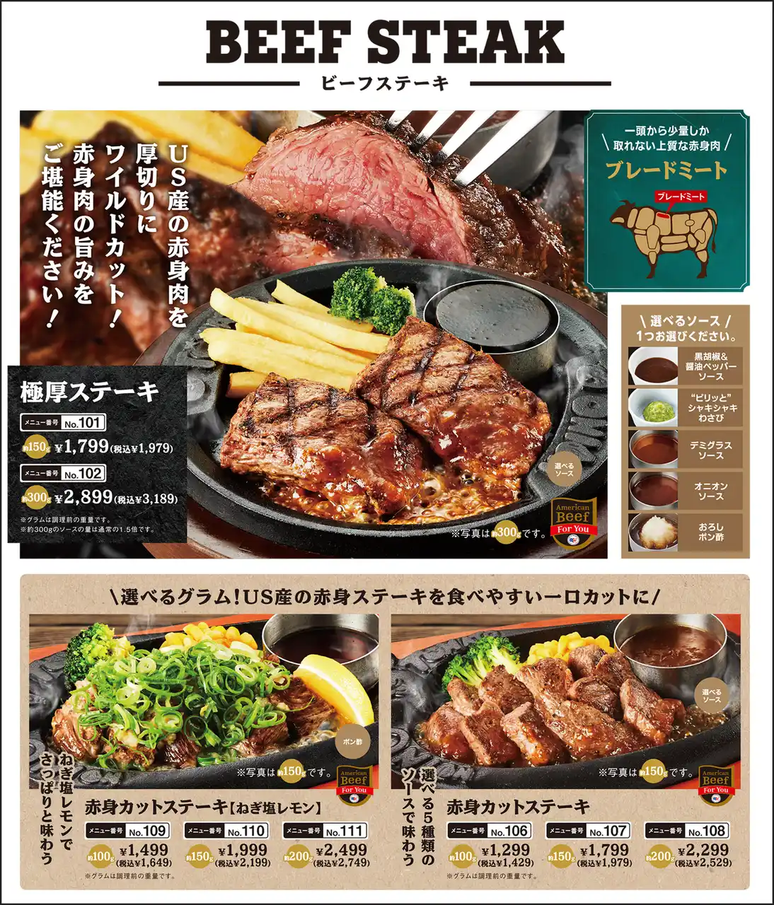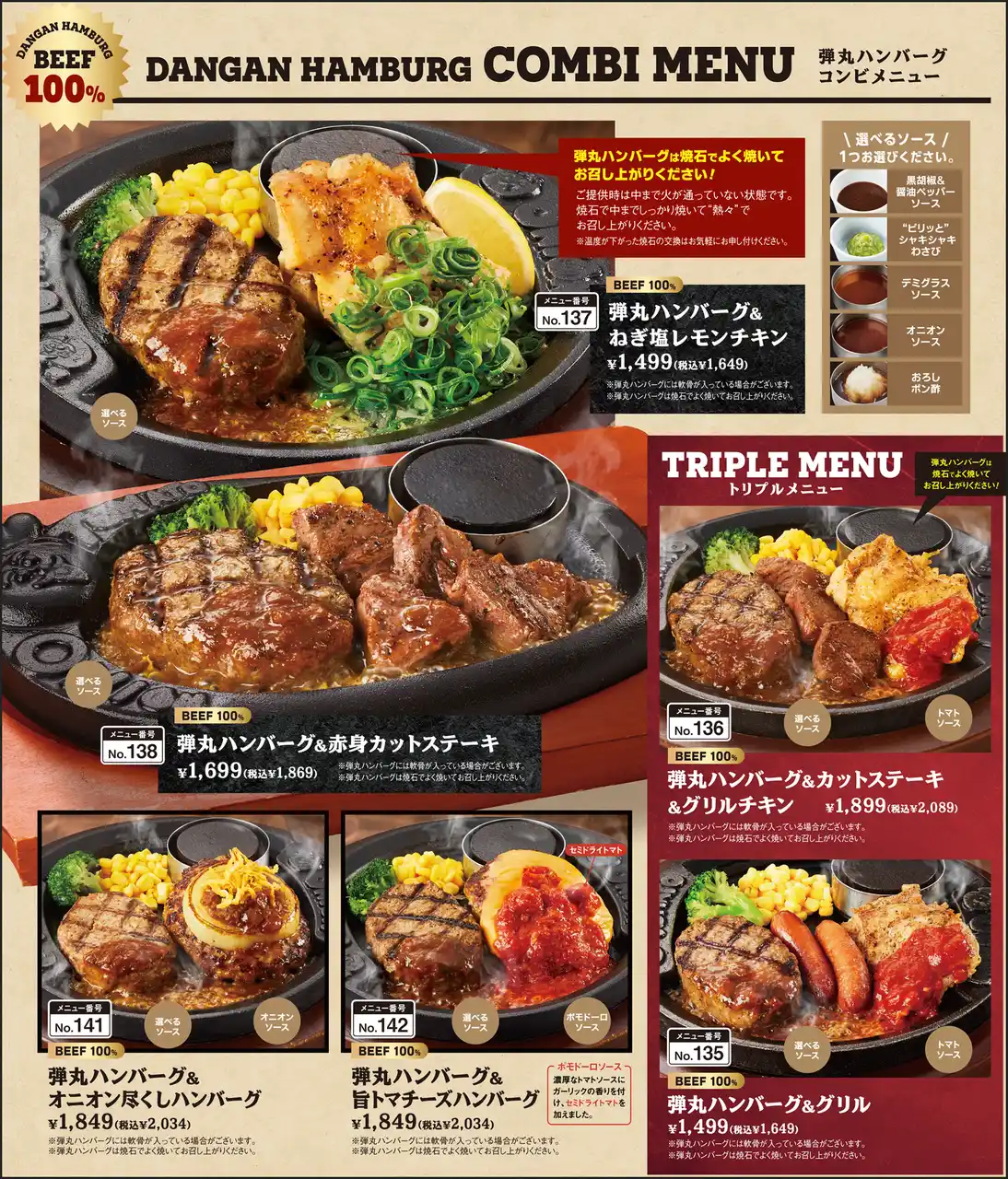 看板メニューの「弾丸ハンバーグ」をはじめとして、人気の鉄板メニューのラインナップがさらに充実。新たにステーキが新登場。さらにコンビメニューも増えて、一度に様々なメニューをお楽しみいただけるようになりました。 |