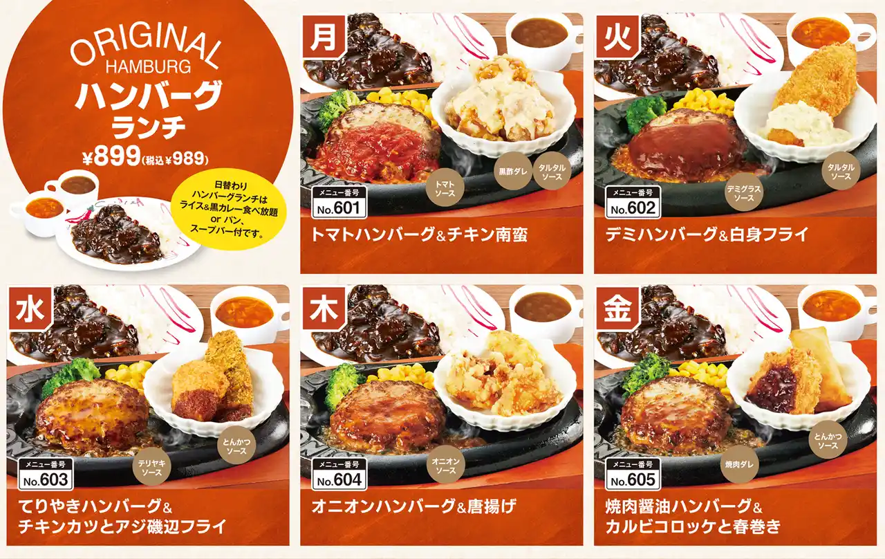 人気の高いハンバーグやステーキのラインナップを、より充実させました。また、オムライスやナポリタン、和食に至るまでバラエティを拡充し、あらゆる世代のお客様にお楽しみいただける内容へとブラッシュアップいたしました。さらに、平日限定の日替わりハンバーグランチは価格を見直し、よりお求めやすくご提供いたします。 |