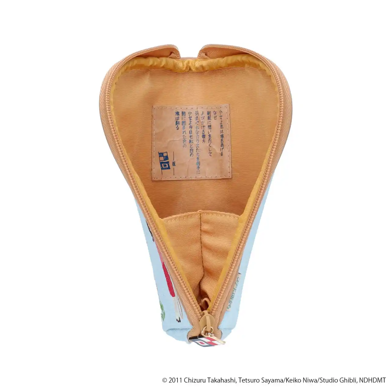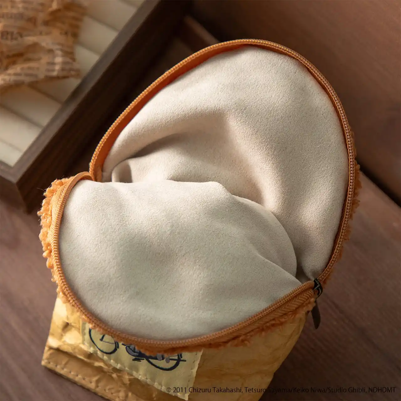 『コクリコ坂から』作中に登場するコロッケをモチーフにしたポーチです。コロッケの衣はパイル生地の起毛を、包み紙の部分は紙素材を使用し、コロッケをリアルに表現しています。織りネームには自転車で坂を下る海と俊のワンシーンやお肉屋さんの店頭に表記されていた値札のデザインを採用するなど、思わず作品を観返したくなるようなこだわりを感じられるアイテムに仕上げました。 |