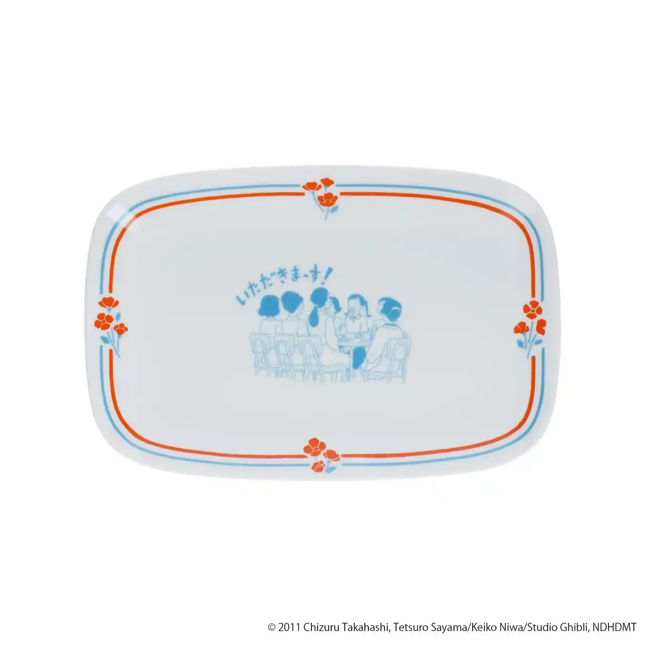 『コクリコ坂から』のオープニングで描かれる、主人公・海の家「松崎家」の朝食風景をデザインしたスクエアプレートです。作品の時代背景に合わせてレトロな白い陶磁器の素材を採用し、くすんだブルーとオレンジのカラーでデザインしました。ハムエッグやサラダを乗せて家族で食卓を囲めば、作中のワンシーンを再現できます。 |