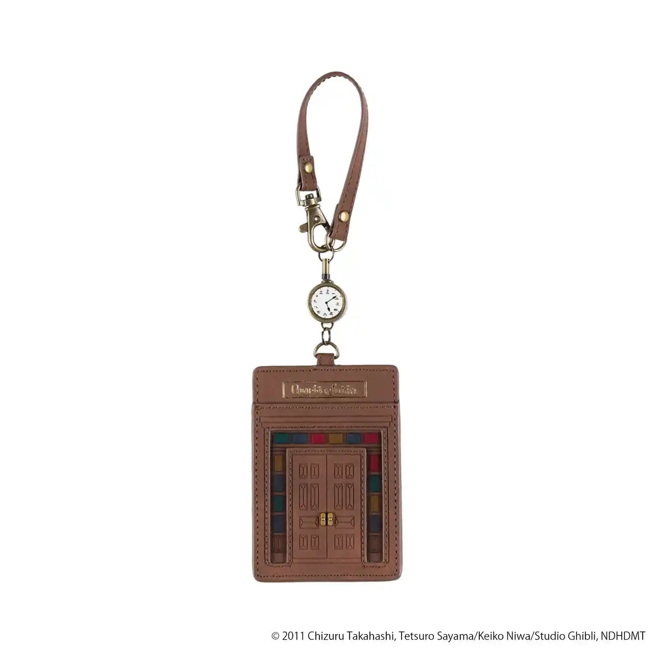 作中に登場する古い洋館「カルチェラタン」をイメージした、リール付きのパスケースです。古びた建物の様子を深いブラウンのカラーで、玄関口のステンドグラス部分をクリア素材で表現しました。リール部分にあしらった時計の針は、海たちがカルチェラタンを訪れた時間帯を指しています。 |