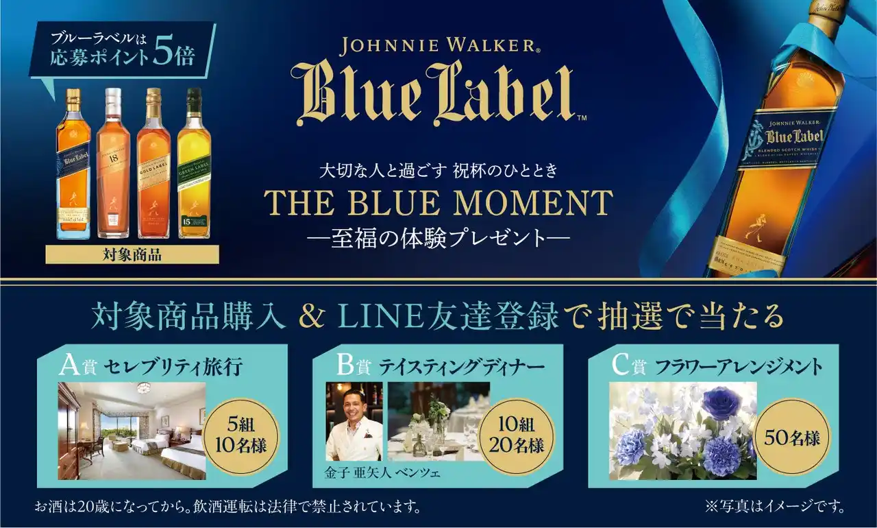 対象期間中に「ジョニーウォーカー ブルーラベル」を含む対象商品を購入のうえ、LINE公式アカウントをお友達登録・購入レシートを登録してご応募していただいた方を対象に、大切な人との“特別な時間”を演出する体験型ギフトを抽選でプレゼントします。 |