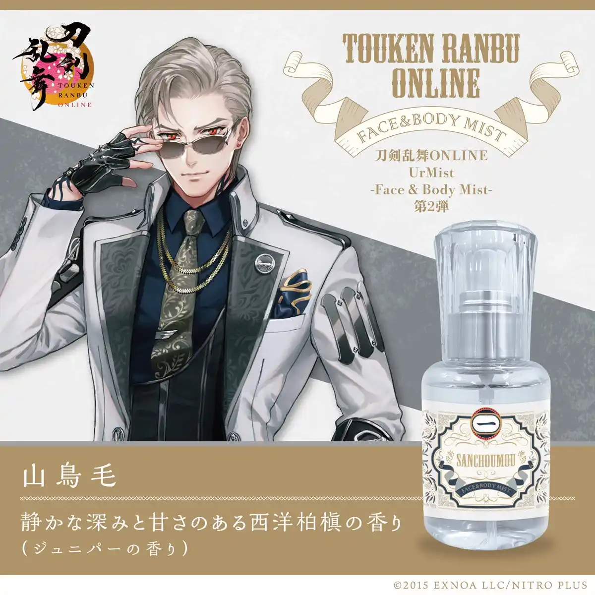 本商品は、PCブラウザ・スマホアプリゲーム「刀剣乱舞ONLINE」に登場する刀剣男士、陸奥守吉行/山姥切国広/豊前江/山鳥毛/後家兼光の5振りをそれぞれイメージしたフェイス&ボディミスト『UrMist(ユアミスト)』です。 |