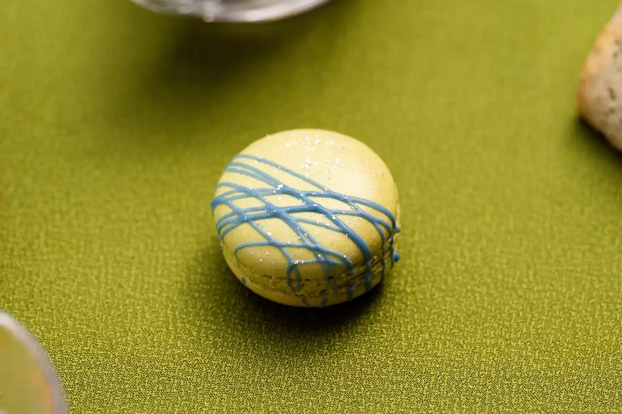 【新緑香る 抹茶マカロン】 夏の竹林を思わせる青の模様と吹き抜ける風をイメージした銀紛が見た目にも涼しい抹茶のほろ苦さとやさしい甘みが調和したマカロン。新緑を思わせる鮮やかな色合いと、軽やかな口どけが印象的です。 |