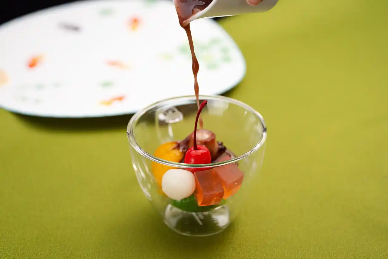 【お手盛り彩りあんみつ】 涼やかな寒天に、彩り豊かな果実や餡をお好みで盛り付けて楽しむ、夏らしい一品。自分だけの一皿を完成させる、和のアフタヌーンティーならではの体験型スイーツです。 |