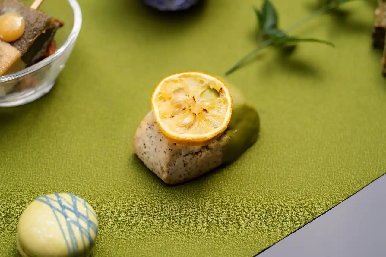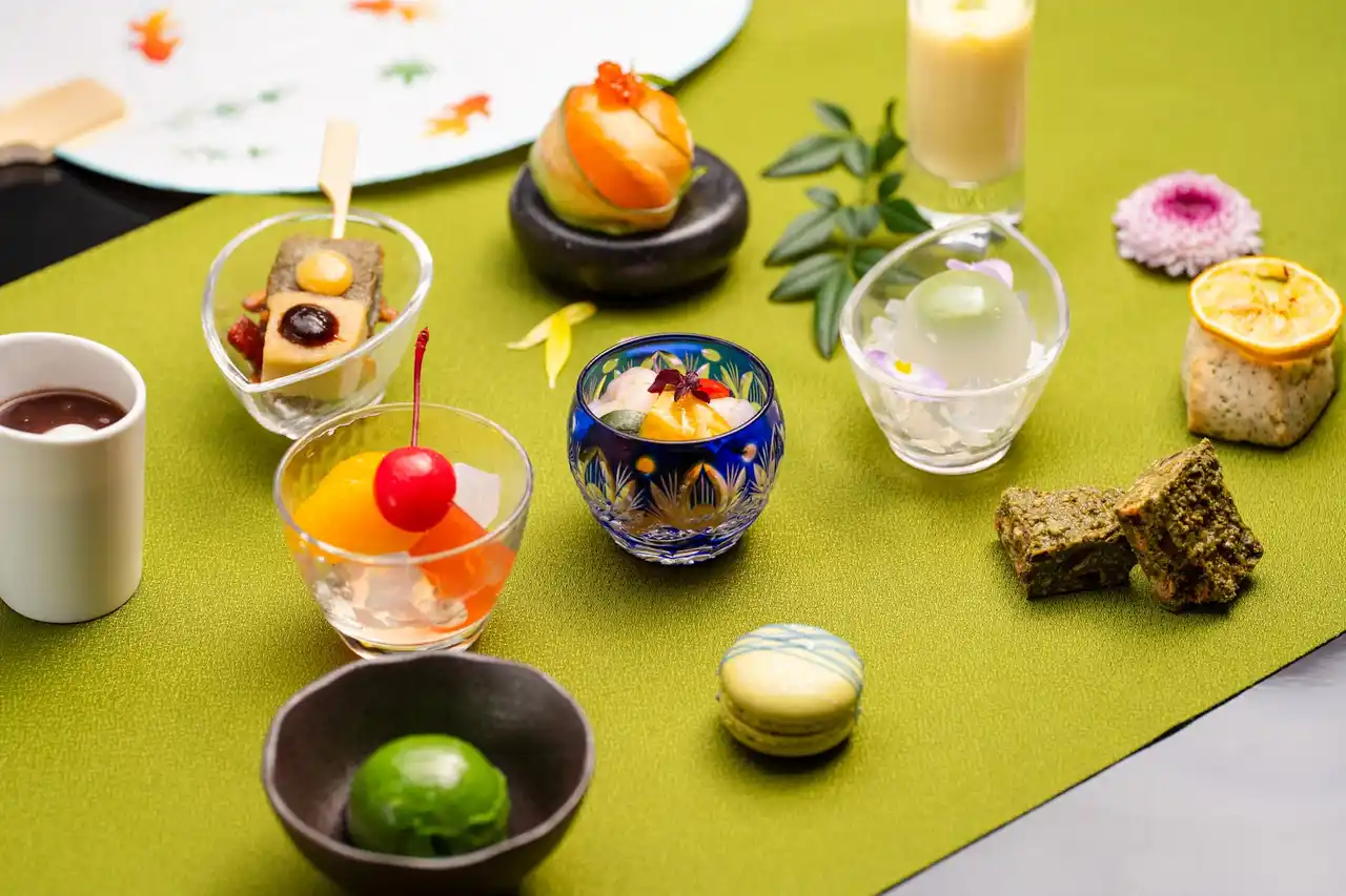 スイーツ :お手盛り彩りあんみつ(抹茶ジェラート、フルーツポンチ、ぜんざい) / 清涼仕立て 葛饅頭 / 新緑香る抹茶マカロン / チョコチップクッキーを練り込んだ 抹茶クランチ / レモン香る抹茶チョコレートを纏った 紅茶スコーン |