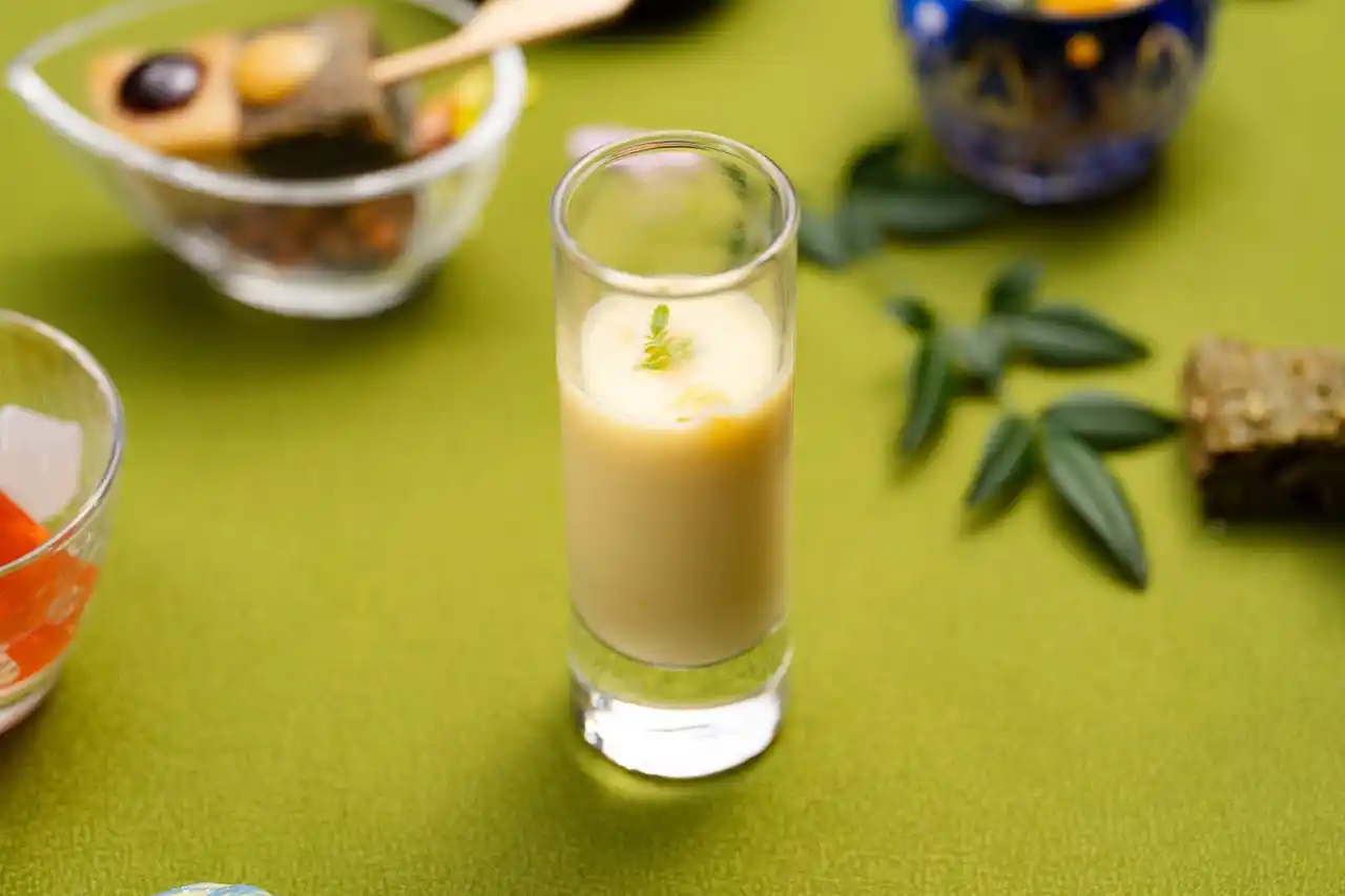 【和だし仕立て 冷やしコーンスープ】和だしのやさしい旨みと、とうもろこしの自然な甘みが調和した冷製スープ。暑い季節でもすっと身体に染みわたる、涼感あふれる味わいです。 |