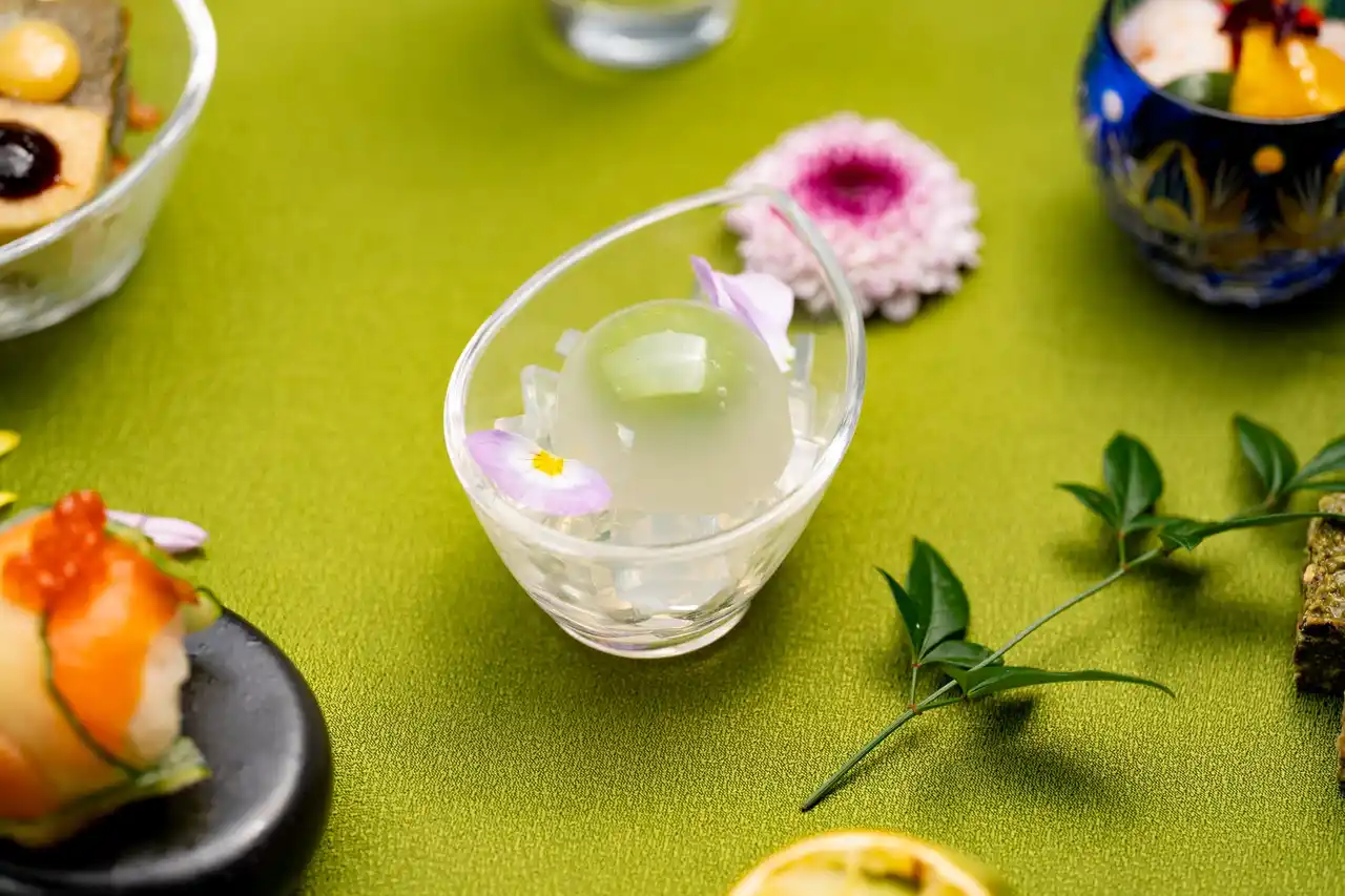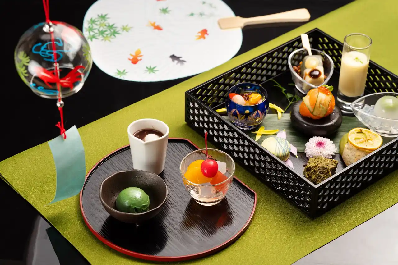 盛り付けには、金魚鉢や風に揺れる青葉を思わせる涼感のある和の器を用い、目にも涼やかな夏の情景を表現。京都らしい情緒と、ホテルならではのモダンな感性が融合した、上質な和のアフタヌーンティー体験をご提供いたします。 |