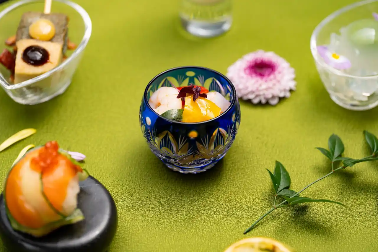 【海老と夏野菜の涼風和え】 プリッとした海老に、瑞々しい夏野菜を合わせた爽やかな和え物。果実の甘みと海老の旨みが夏らしい涼風を運びます。 |