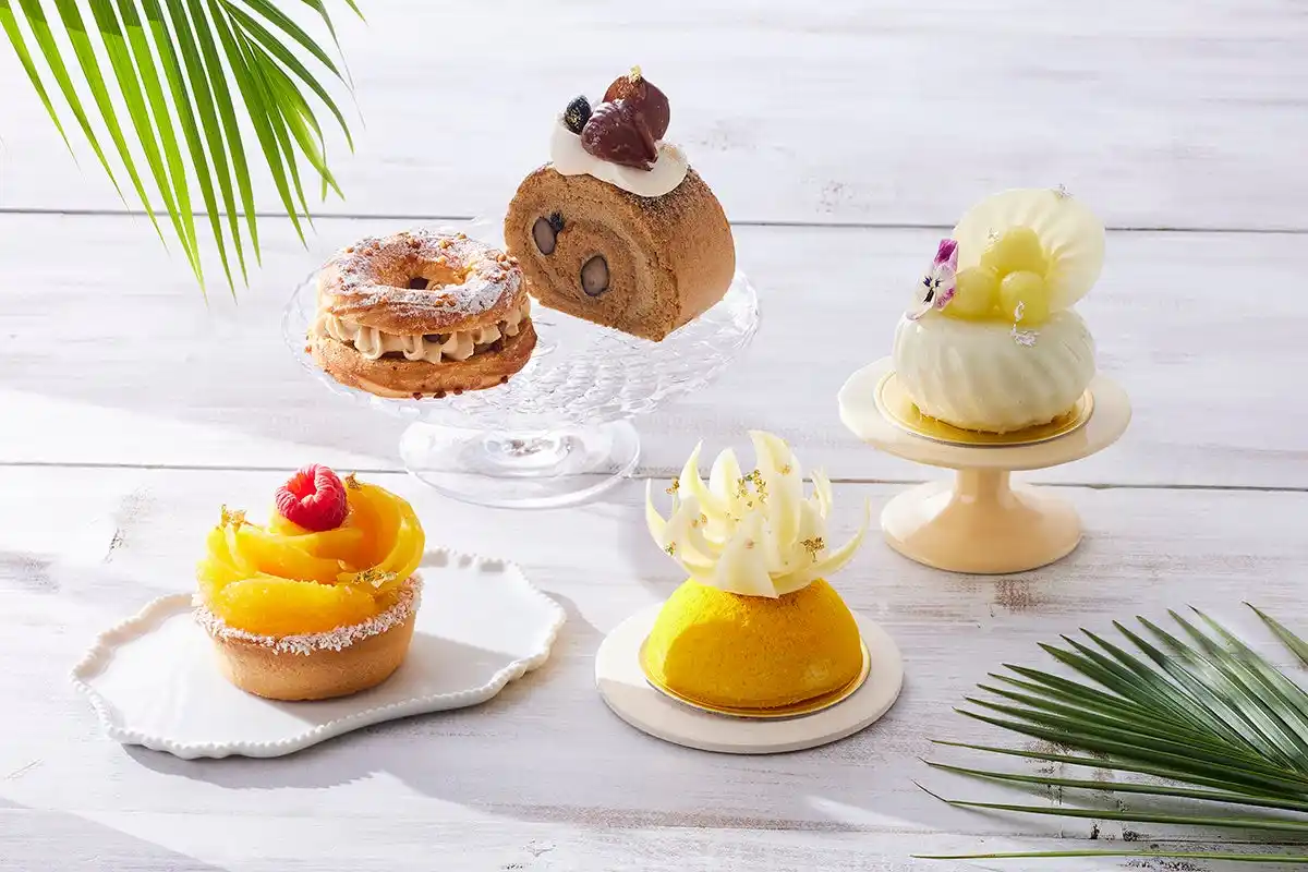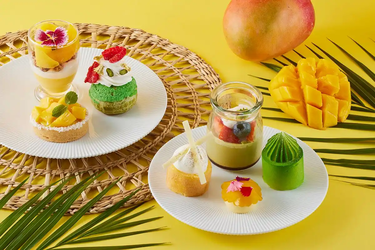 | 全7種のスイーツには、マンゴープリンにオレンジ風味のビスケットを重ね、果肉をあしらった「マンゴーとオレンジのヴェリーヌ」、なめらかな口どけの「マンゴーレアチーズケーキ」、「マンゴーロールケーキ」に加え、「ピスタチオプリン」や、ピスタチオのカスタードクリームとマンゴーペーストを合わせたシュークリームなど、マンゴーとピスタチオそれぞれの魅力を活かしたメニューが揃います。中でも、宮崎県産アップルマンゴーを贅沢に使用したタルトは、芳醇な香りと食べ応えのある果肉感を味わえる一品です。 | ||||||||||||||