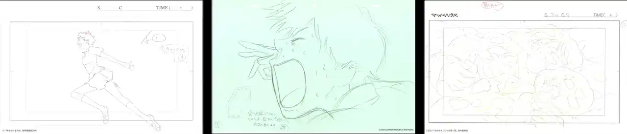 本展では、『時をかける少女』『サマーウォーズ』『おおかみこどもの雨と雪』をはじめとする代表作を中心に、絵コンテ、レイアウト、原画、美術ボードなど300点以上の制作資料を展示します。絵コンテの演出指示から精緻な筆遣いまで間近にご覧いただけます。また天井高5m・約1,200平方メートル の大空間を活かし、名シーンを体感できる映像展示を展開。スクリーンで観ていたあの瞬間を、制作の軌跡とともに追体験することができます。 |
