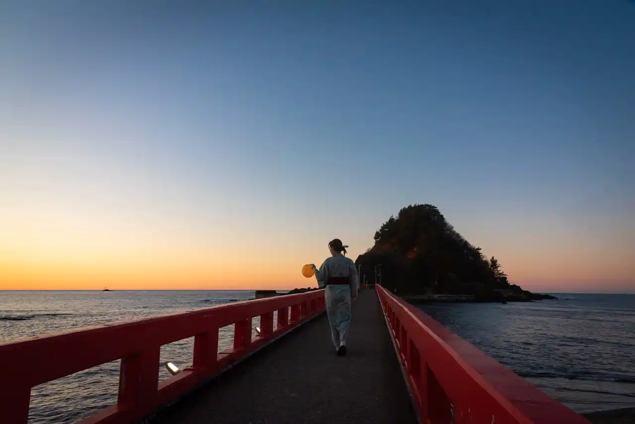 日没から夜にかけて、ライトアップされる朱塗りの橋と、海に浮かぶ白山島のシルエットが幻想的な景色を描き出します。 あわせて、由良海岸では手持ち花火もお楽しみいただけ、思い思いの灯りの中で夏の夜をお過ごしいただけます。 |