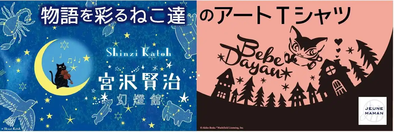 イオンは4月16日(木)より、「イオン」「イオンスタイル」約330店舗※1)と「イオンスタイルオンライン」にて、大人世代のおしゃれ服「JEUNE MAMAN(以下、ジュネママン)」から、ねこTシャツコレクション「宮沢賢治幻燈館」8種類・「べべダヤン」」12種類※2)を販売します。 |